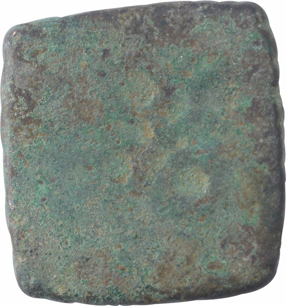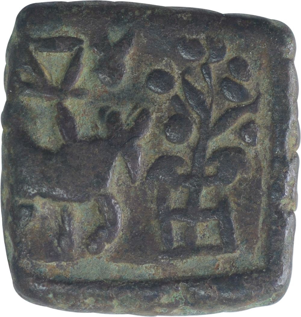 Ujjain Region, Copper Unit, Obv:bull to right with indradhvaja between two taurines above, railed tree on right,Rev:ujjain symbol,3.09g, 13.86 x 13.62mm,(W. Pieper # P.g no 208, Coin no 340),about extremely fine,Rare.