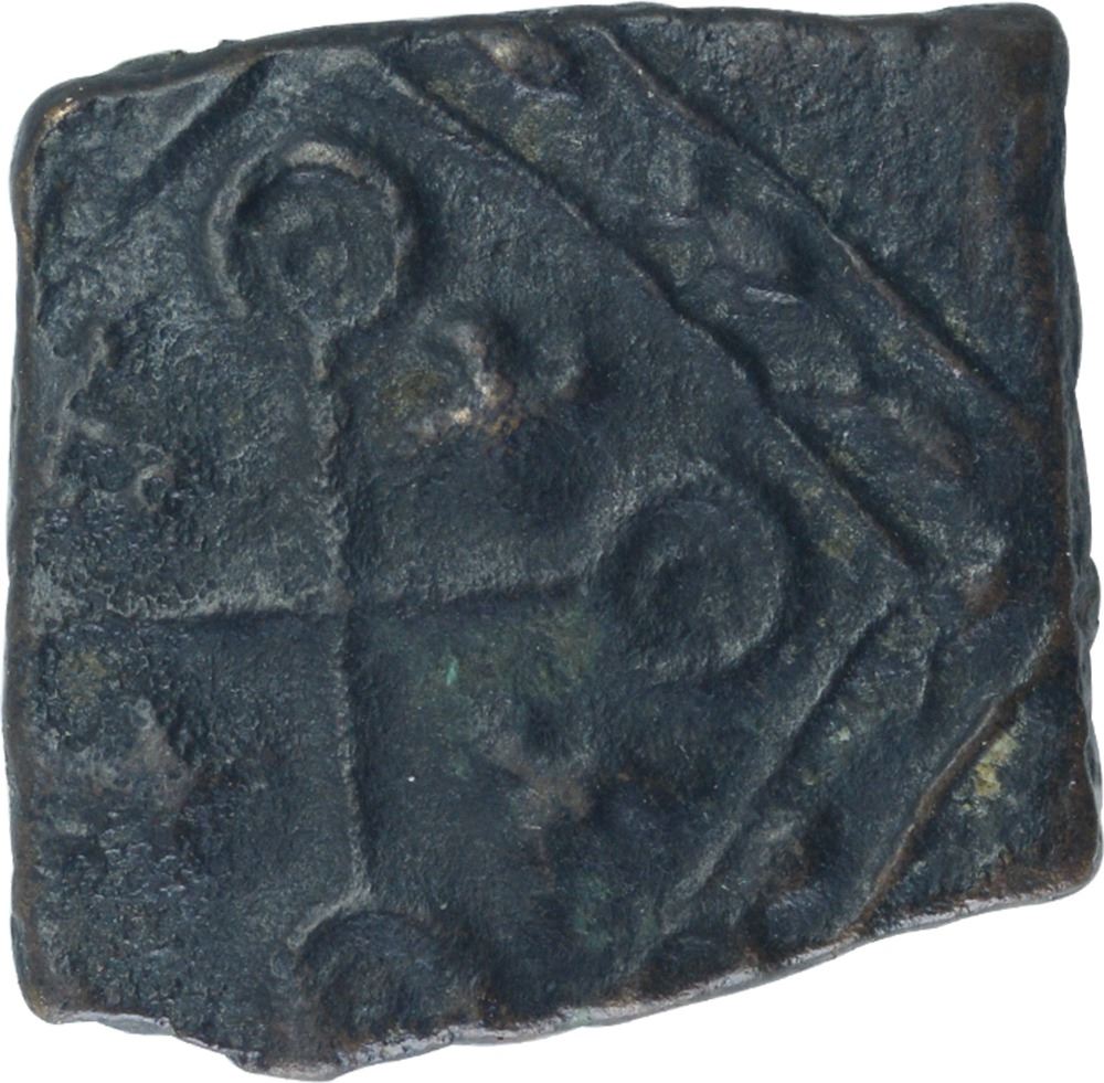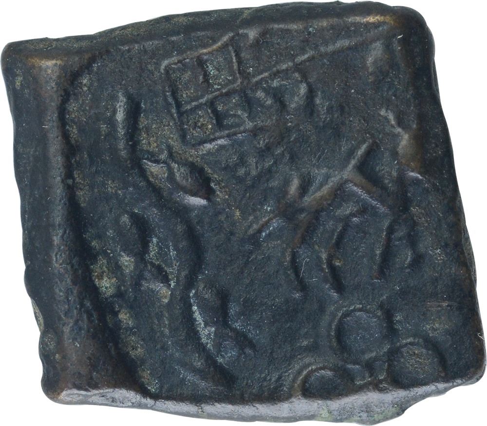 Ujjaini Region, Copper Unit,Obv:tree railing, horse, ujjaini symbol and fishes flowing in the river,Rev:ujjaini symbol within a double line box with fishes in between,3.28g, 15.5 x 14.5mm,about very fine+,Rare.