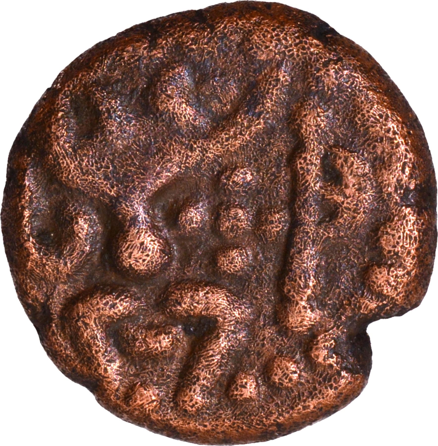 Venad Cheras(11 Century CE),Copper Unit, Obv:theking seated in Chola style facing to the right, a battle-axe and cluster of dotsin front,Rev:an elephant standing facing to the right,3.16g, 14.95mm, (The Coins of Tamilnadu, A. Seetharaman # Pg. 189 # 33),about very fine,Rare.