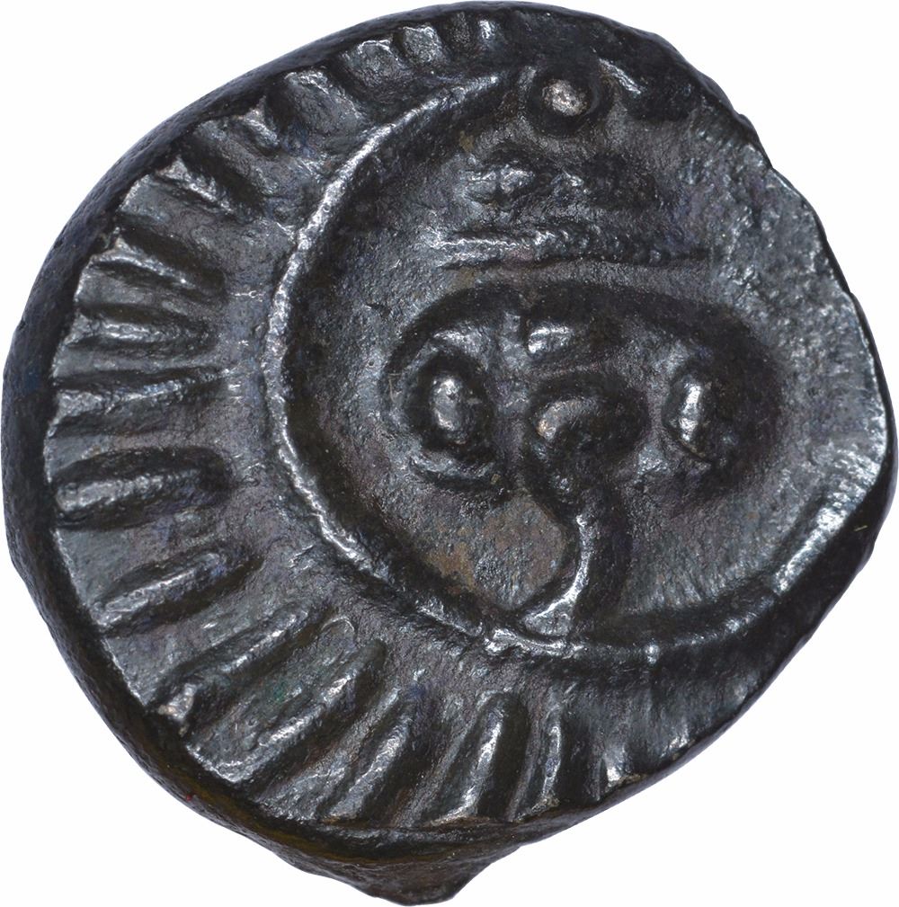 Vishnukundin Dynasty(475-615 AD), Copper Unit, Obv: shankh shell between standards, ornamental border, Rev: lion standing right with paw raised, 1.65g, 14.23mm, about very fine.
