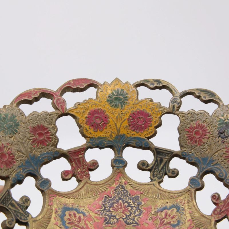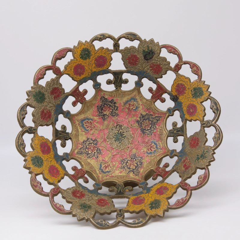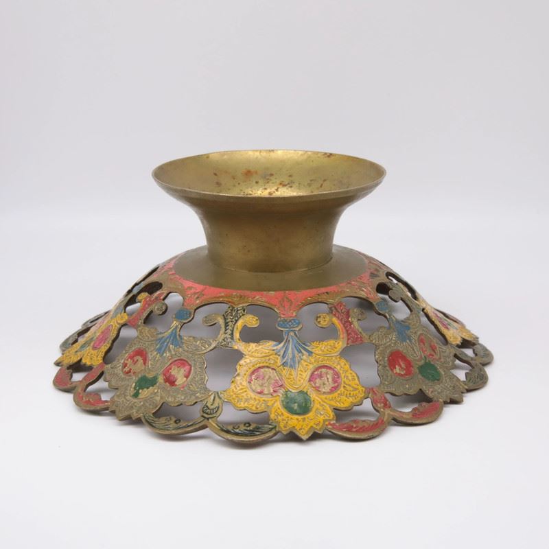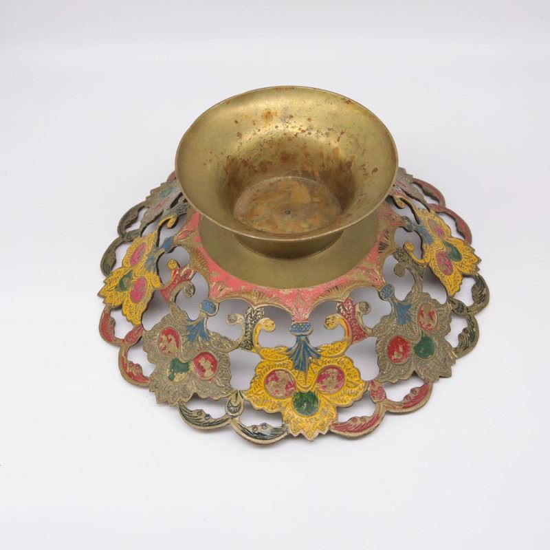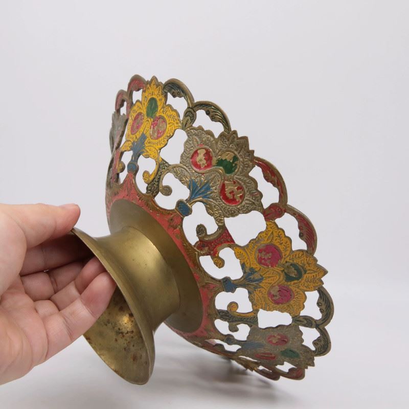This offering dish is crafted in copper, featuring a flaring mouth with openwork floral motifs in red, yellow, blue, and green. The surface is decorated with burnished multicolor patterns, while the tall trumpet-shaped foot provides balance and dignity. Such dishes were often used in temples or important ceremonies as ritual offering vessels, combining both functionality and ornate craftsmanship.