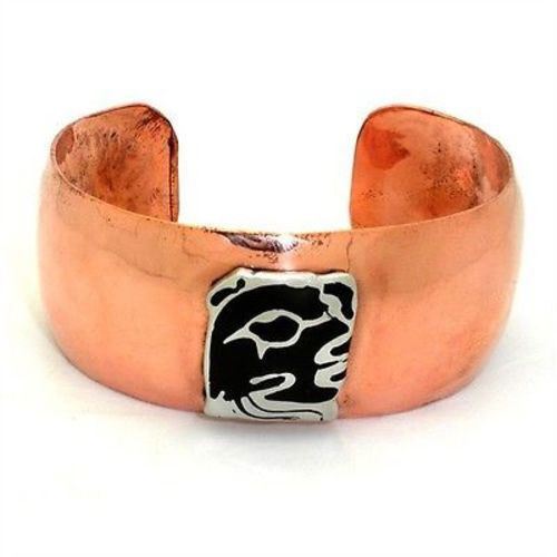 Copper Cuff with Alpaca Silver Mayan Glyph - Artisana **|**|** These brilliant handmade copper cuff bracelet features an alpaca silver Myan Glyph. The bracelet is 1 inches tall measuring 6.25 inches from end to end. #MJEBAZ_219013