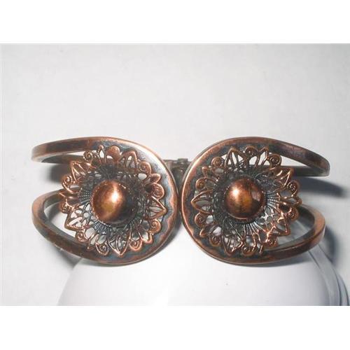 Fabulous filigree work on this beautiful copper bangle. Fits snugly and securely on any average size wrist and looks amazing - sure to draw many compliments. Two large size copper filigree flowers with a solid domed centre that each measure one full inch in diameter. The oval shaped measurement of the bangle from the inside is 2-1/2" inches by 1-3/4" inches. Excellent vintage condition, no flaws.