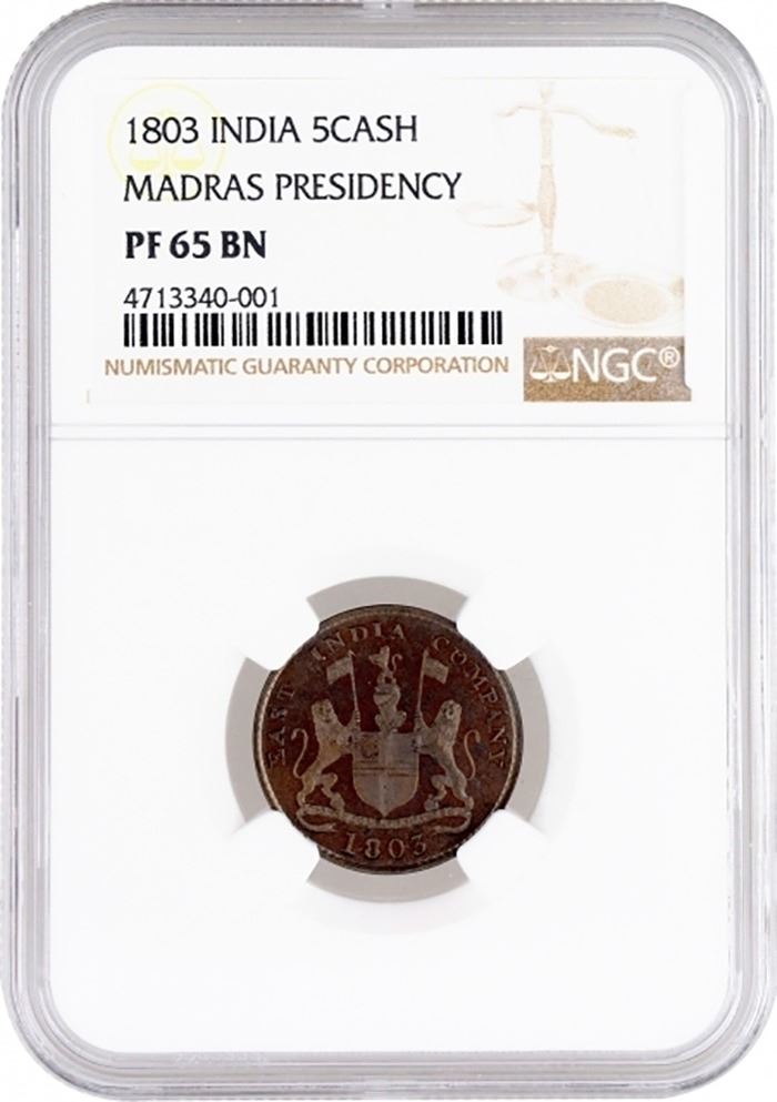 Madras Presidency, Soho Mint, Copper 5 CashOriginalProof, 1803 AD, Obv: The arms of the company with the date below, Rev: value in Persian and English, (Stevens # 5.143), graded slabbed by NGCas PF 65BN, Extremely Rare.