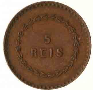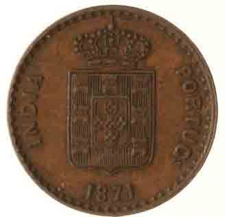 India-Portuguese, Luiz I(1871-1889 AD), 5 Reis, 1871, Obv:crowned arms,Rev:value within wreath,(KM# 302),about extremely fine, Scarce.