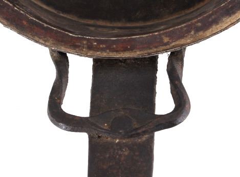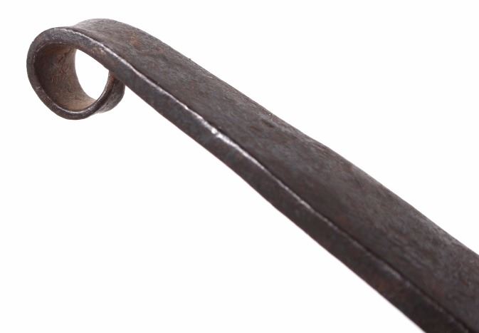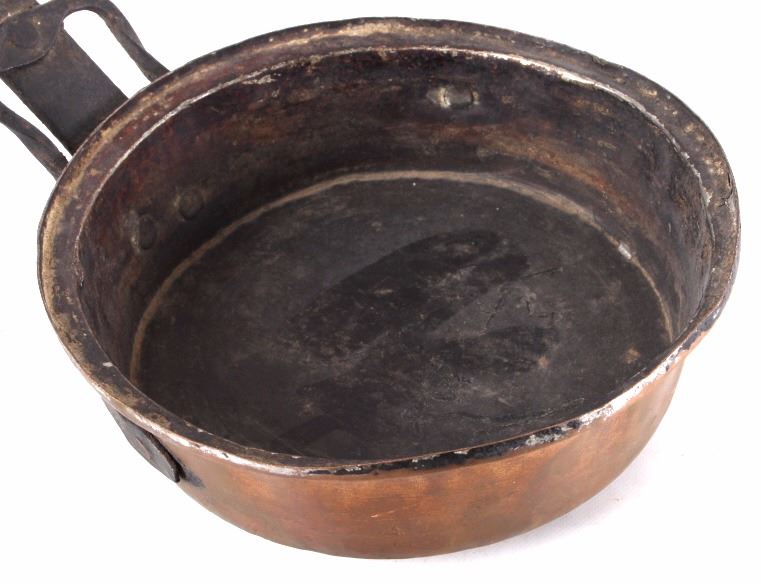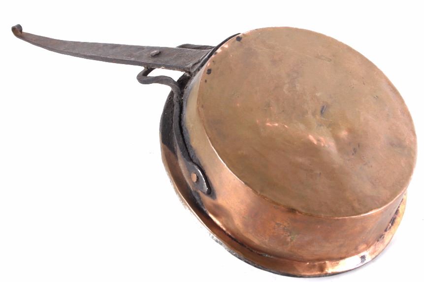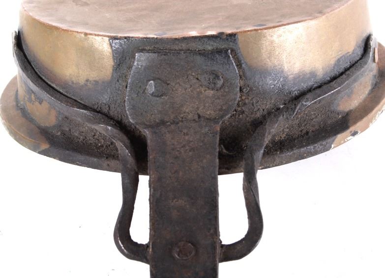 This lot features a copper fry pan with a ornate forge iron handle. This piece has a ornately hand forged iron handle that is solidly attached. This piece is from the 19th century and is in good condition for its age. It measures 8" D x 16 3/8" L x 2 1/4" H