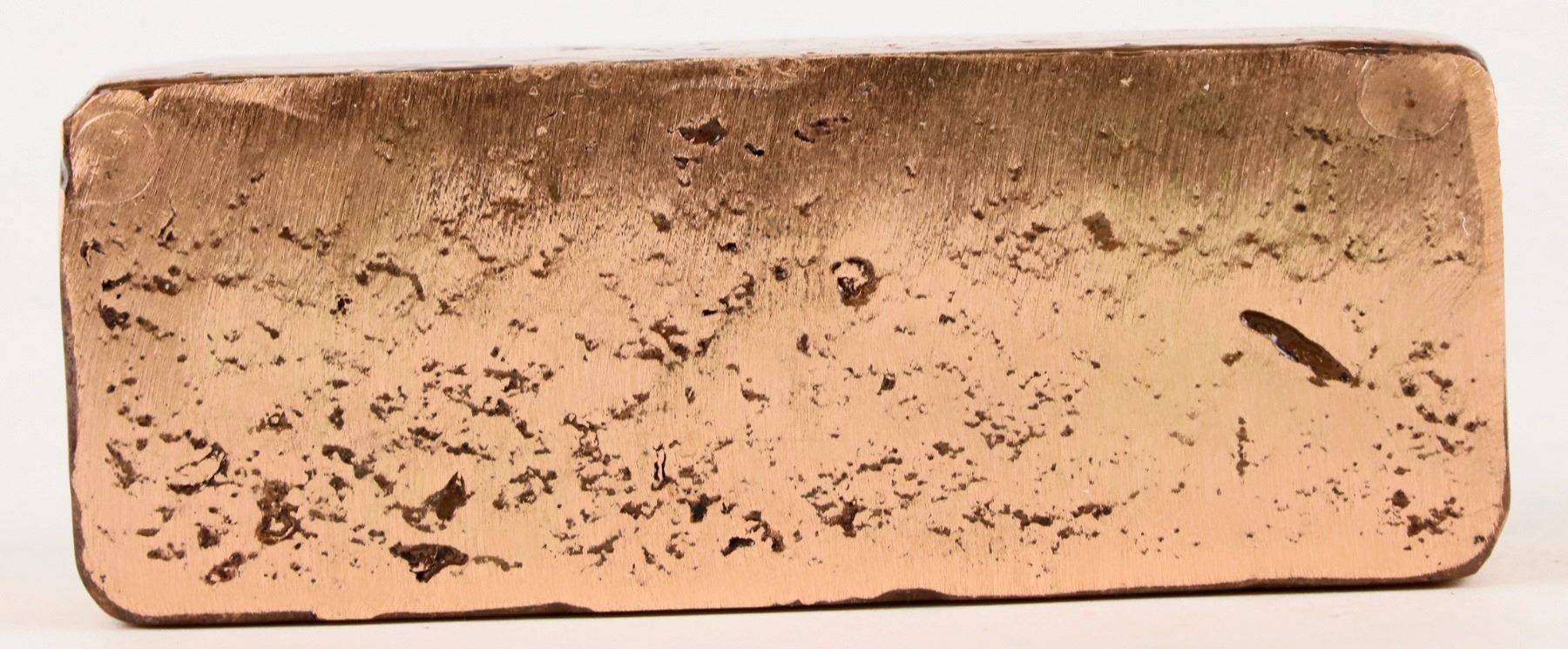 Copper ingot, about 865 grams (just under ten ounces). 4" x 1.5" x 1". Polished. From Fred Holabird collection. Origin forgotten, unfortunately.