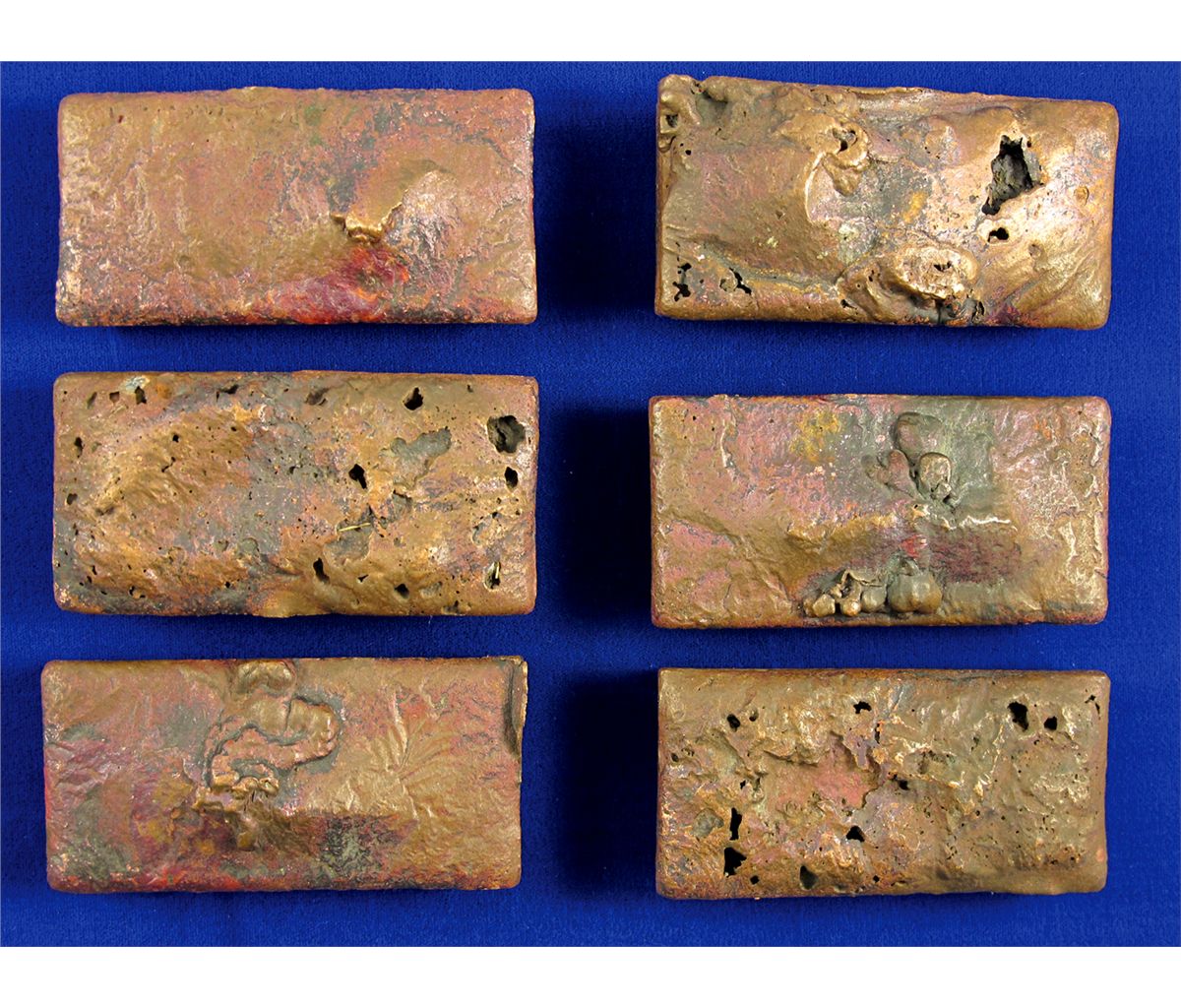 Lot of 6 ingots marked DM&MCO and measure 3.75" x 1.75" x 1." Average weight: 1 lb. 10 oz. These ingots are possibly from the Detroit Mining and Milling Co., which may have been associated with the Detroit Copper Mining Company. The company was co-founded by Captain E. B. Ward, a wealthy steamboat owner from Detroit, Michigan, and William Church, a mine speculator from Denver, Colorado. The company consisted of 145 mining claims near Morenci and the mines produced the "Detroit lode," which yielded about 140 pounds of copper per ton of ore mined. Detroit Copper Mining Company was the only company of any size to operate in the area until 1900 and the company also owned a large store, a hotel, and considerable amounts of additional property in and around Morenci. Fred Holabird speculates that these bars may have been sold to tourists after the turn of the century, perhaps at the company owned store or hotel. As technology advanced and America began to electrify, a huge need for copper arose and resulting in a "Copper Boom." -49220