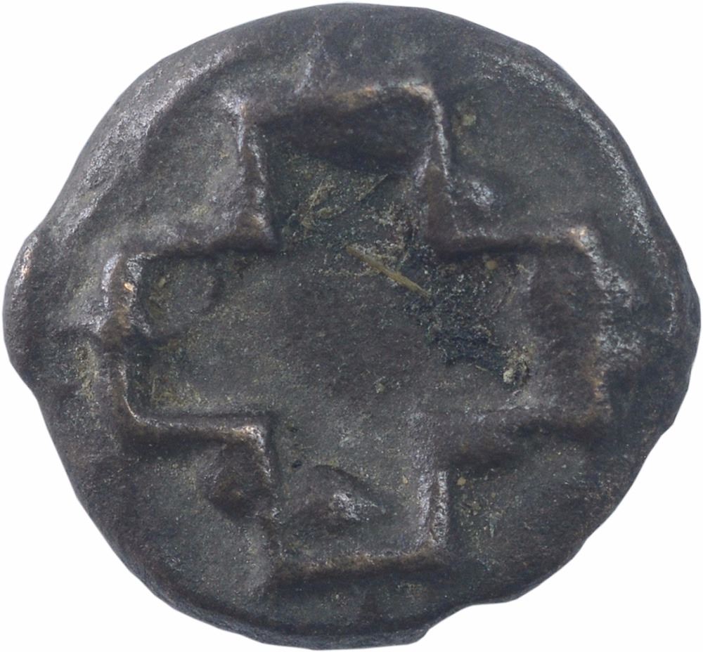 Maurya-Sunga, CopperKarshapana,Obv:tree in railing, railing has 6 compartments,Rev:hollow cross,1.92g, 12.45mm,(W.Pieper# p.no 182,Coin no 215),about extremely fine.