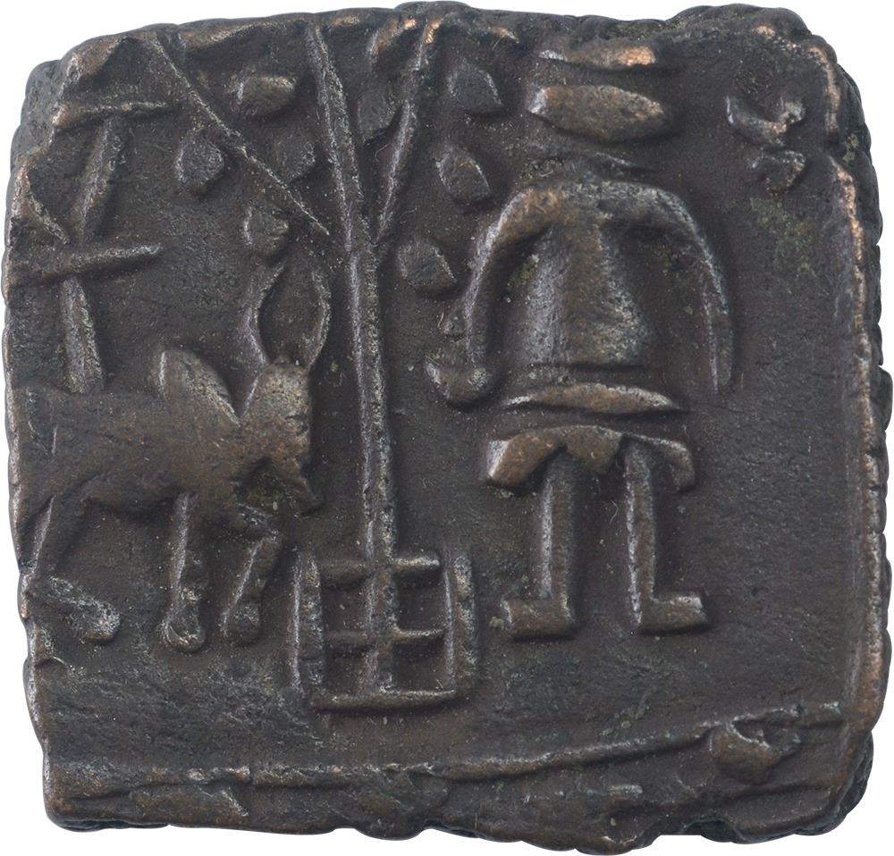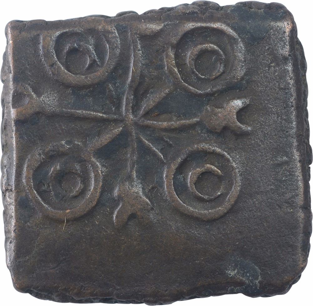 Ujjain Region, Copper Karshapana, Obv:treerailing, standing siva on right, bull on left, fishes flowing in the river below, on right two taurines on left,Rev:double-orbed ujjain symbol with four extra arms arising from the centre, each ending with a taurine,7.45g, 21.05 x 20.04mm,(W. Pieper # Pg.no 204, coin no 322),about extremely fine,Scarce.