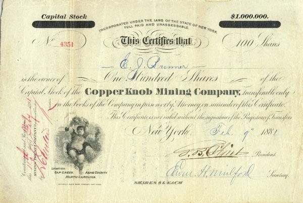 1881. New York. Stock certificate for 100 shares. Black. Small cherub vignette at lower left. Very Fine
