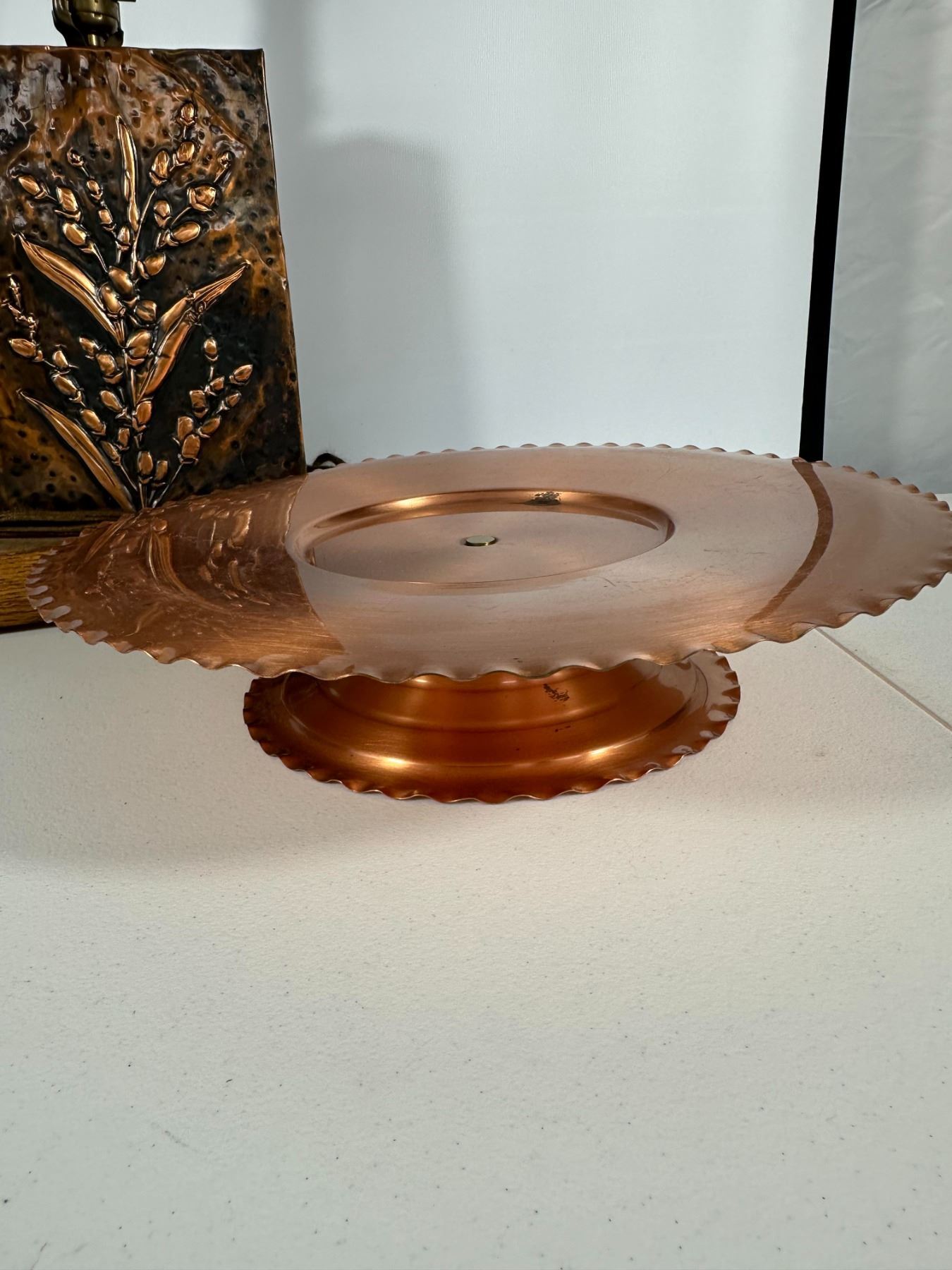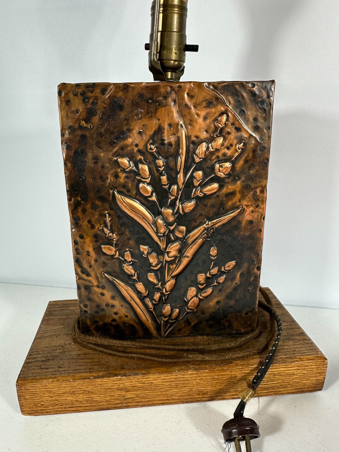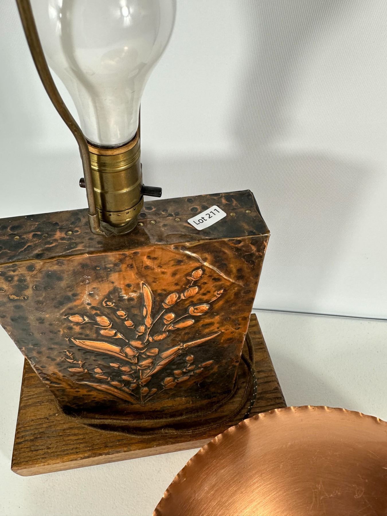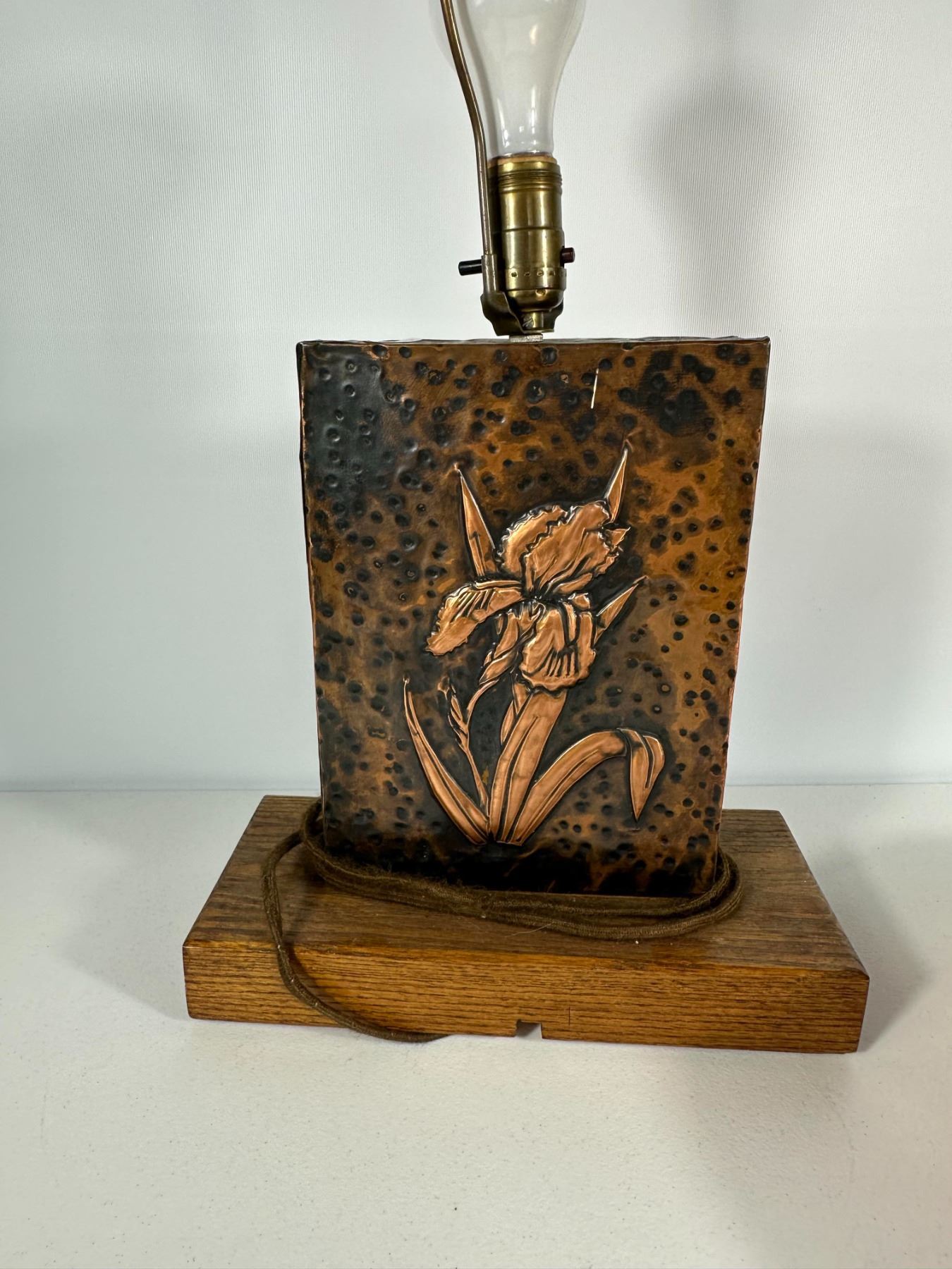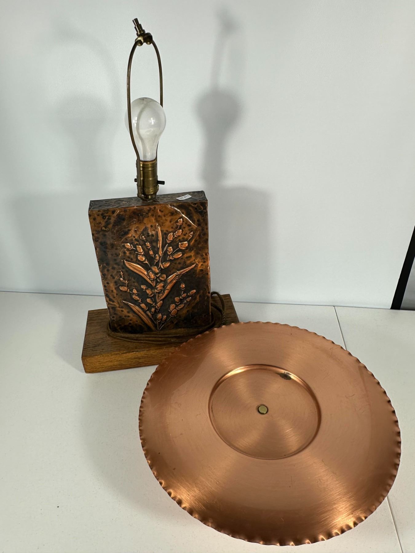 Includes a hammered copper lamp with floral design on wood base and a large round copper tray. Warm-toned vintage home décor pieces.