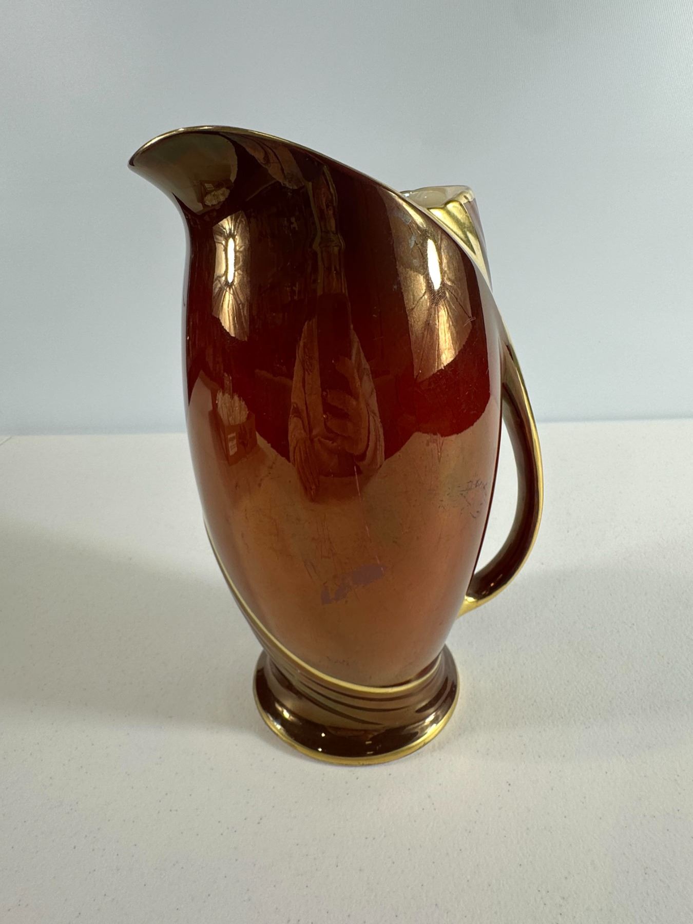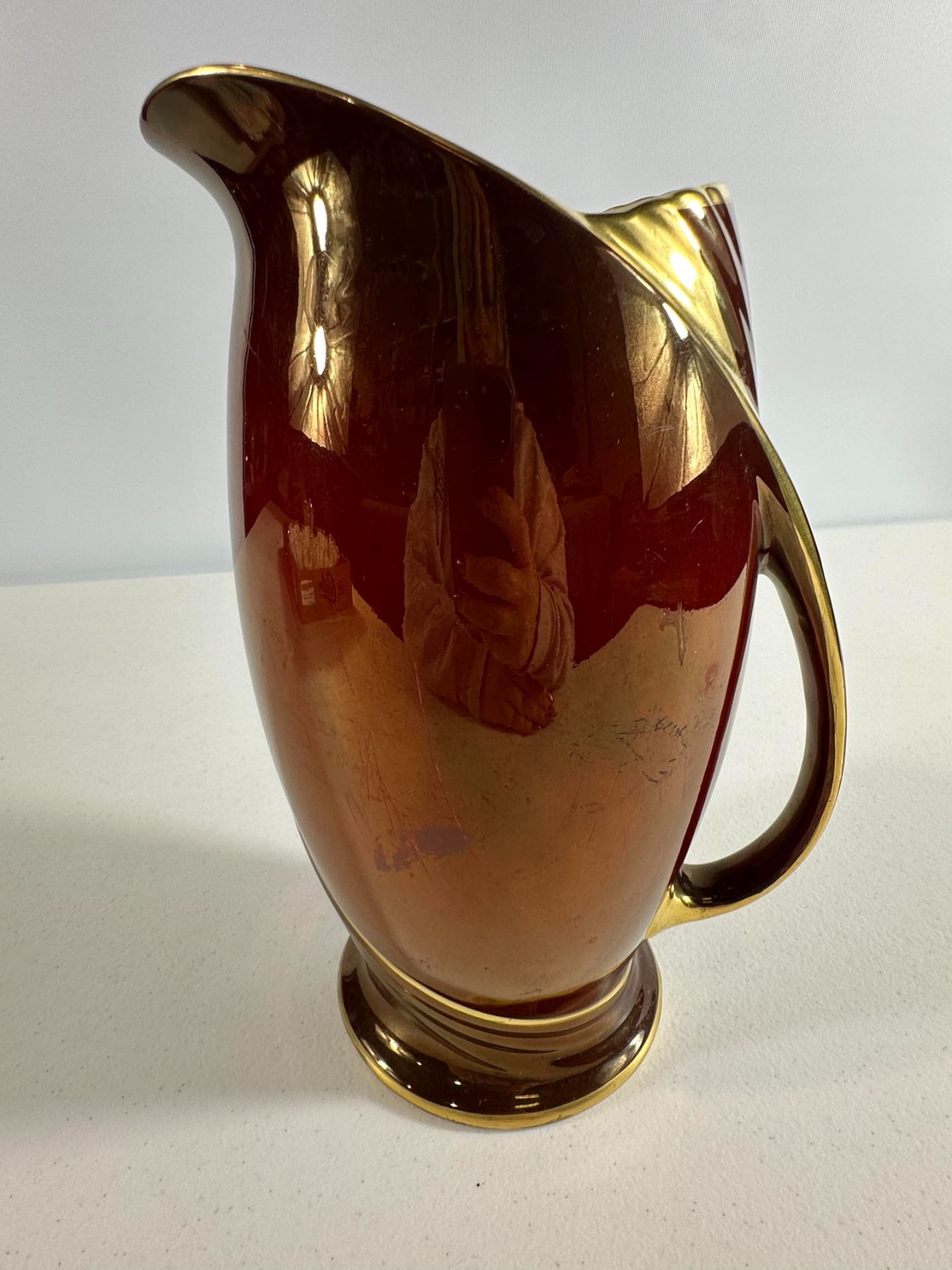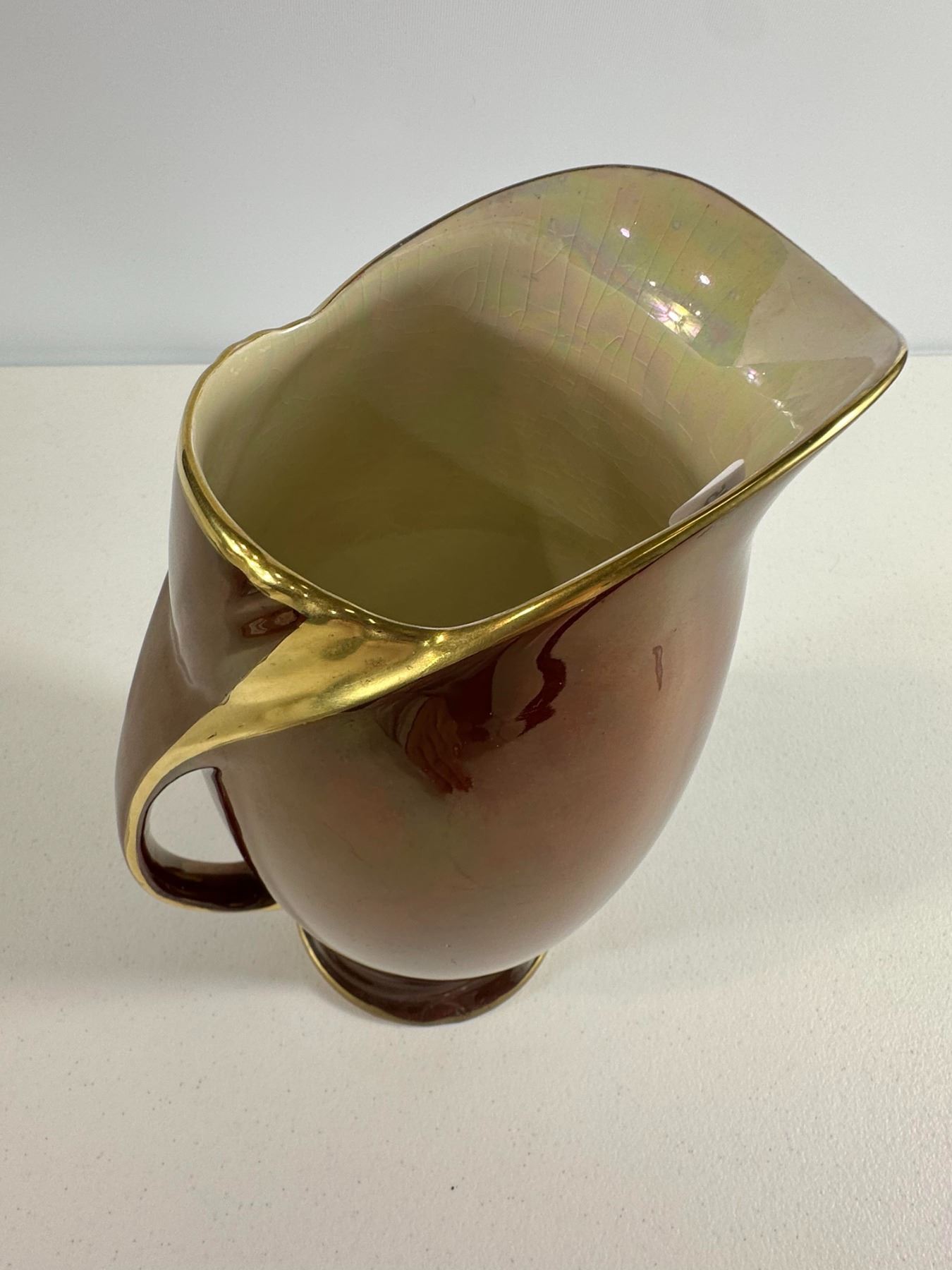 Rich copper 'luster glaze pitcher with gilt trim and curved handle. Classic Victorian look; expected crazing and small scuffs.