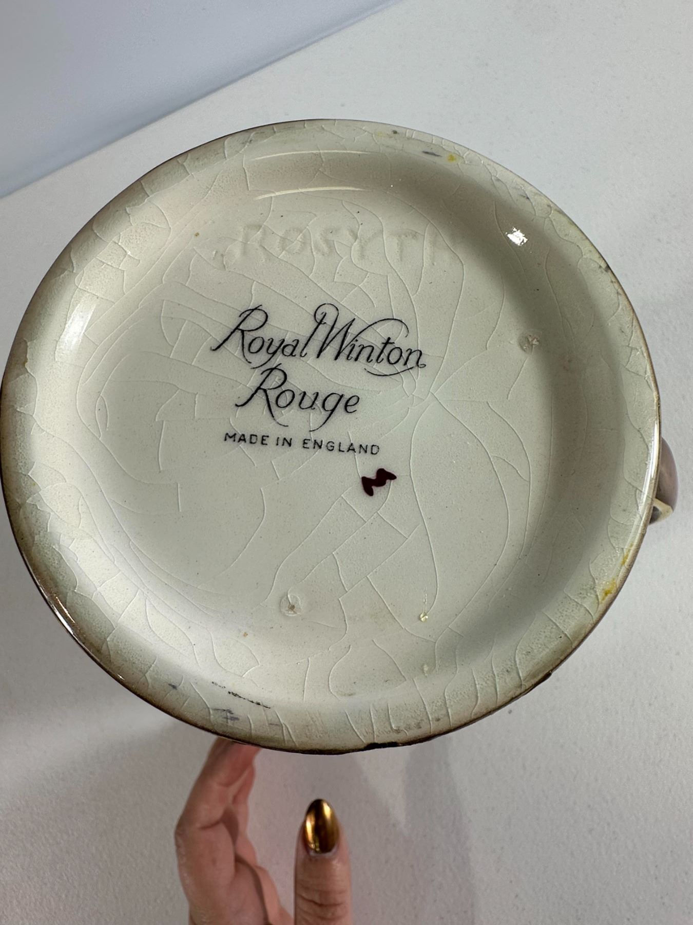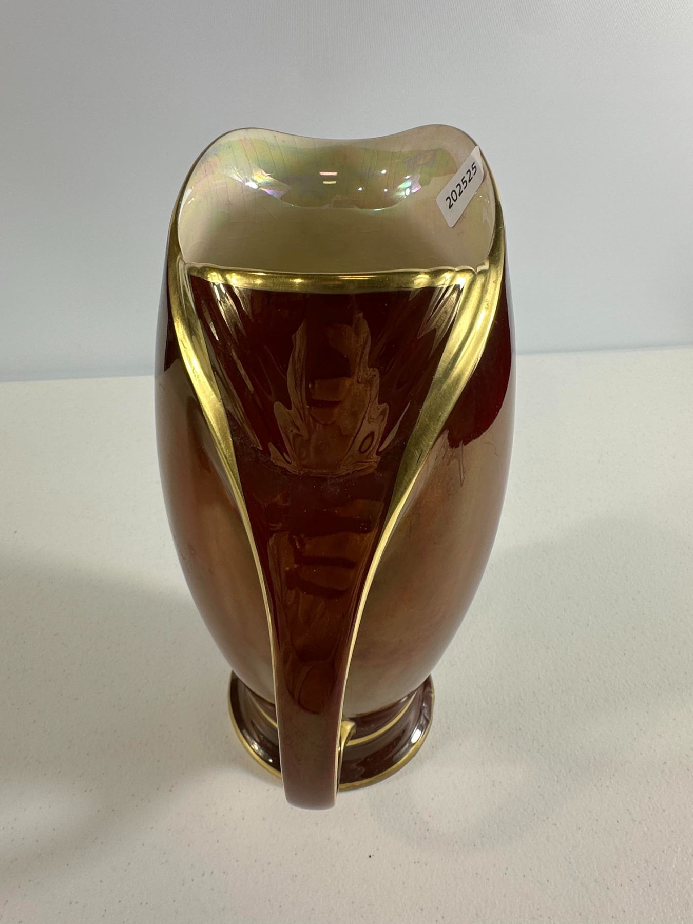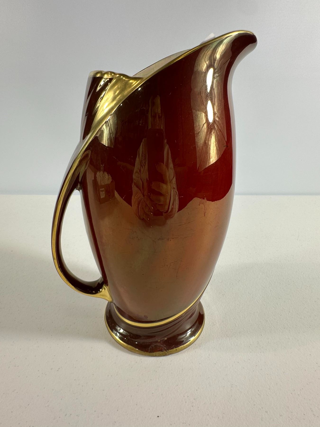 Rich copper 'luster glaze pitcher with gilt trim and curved handle. Classic Victorian look; expected crazing and small scuffs.