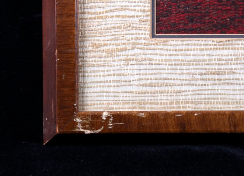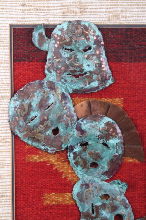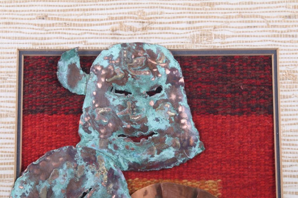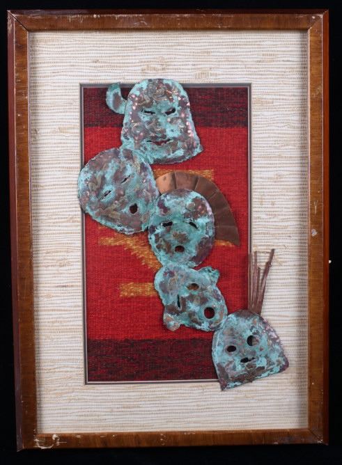 Included in this lot is a framed copper mask and woven blanket art. The piece features five connected copper masks showing cut holes forming the eyes and mouths, three of which show decorative head pieces. The five masks show a green/ teal oxidization coating across most of the masks. The masks are set on a hand woven blanket showing red construction with a dark red stripe across the top and bottom and a gold geometric design at the center. The art is set into a wooden frame with a tan border around the piece. The piece shows good condition overall, with some light wear across the frame. The frame measures 15" wide by 20 3/4" tall, with the art measuring 9 1/2" at the widest by 14 3/4" tall.