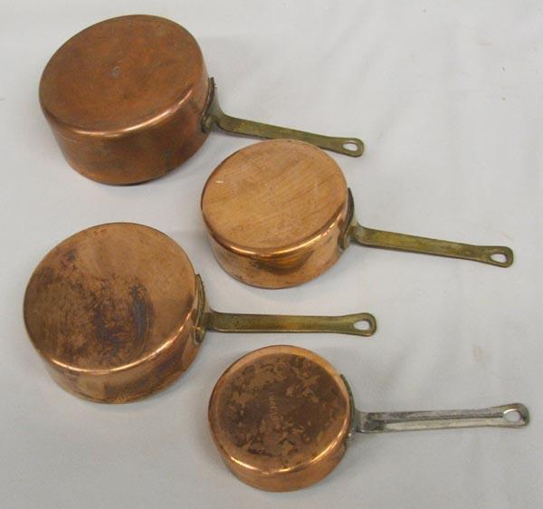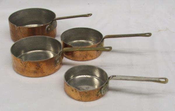 Copper Miniature Pans Measuring Cups, 1/4 c to 1 c measuring, largest measures approx. 7'' long with handle and 1.5'' high. SHI $20.