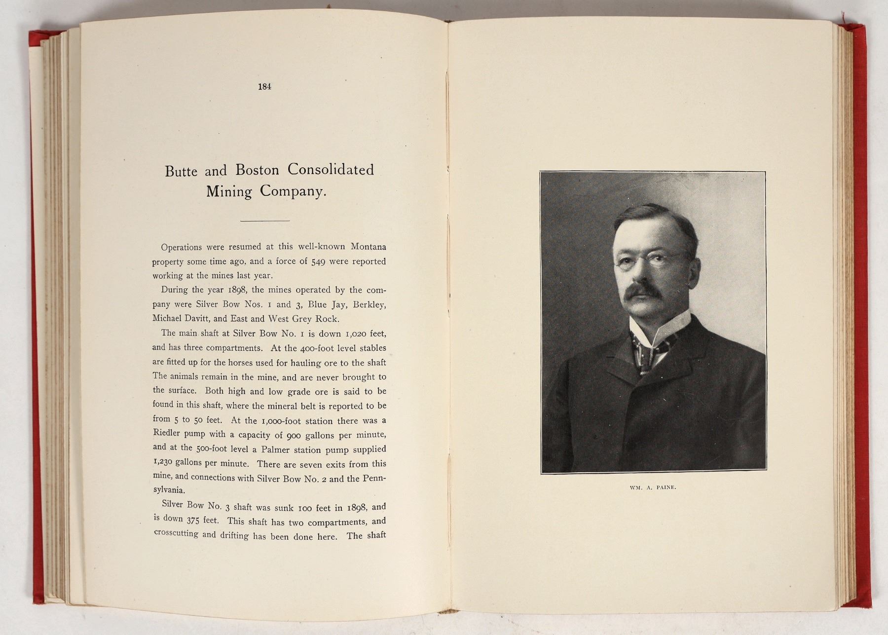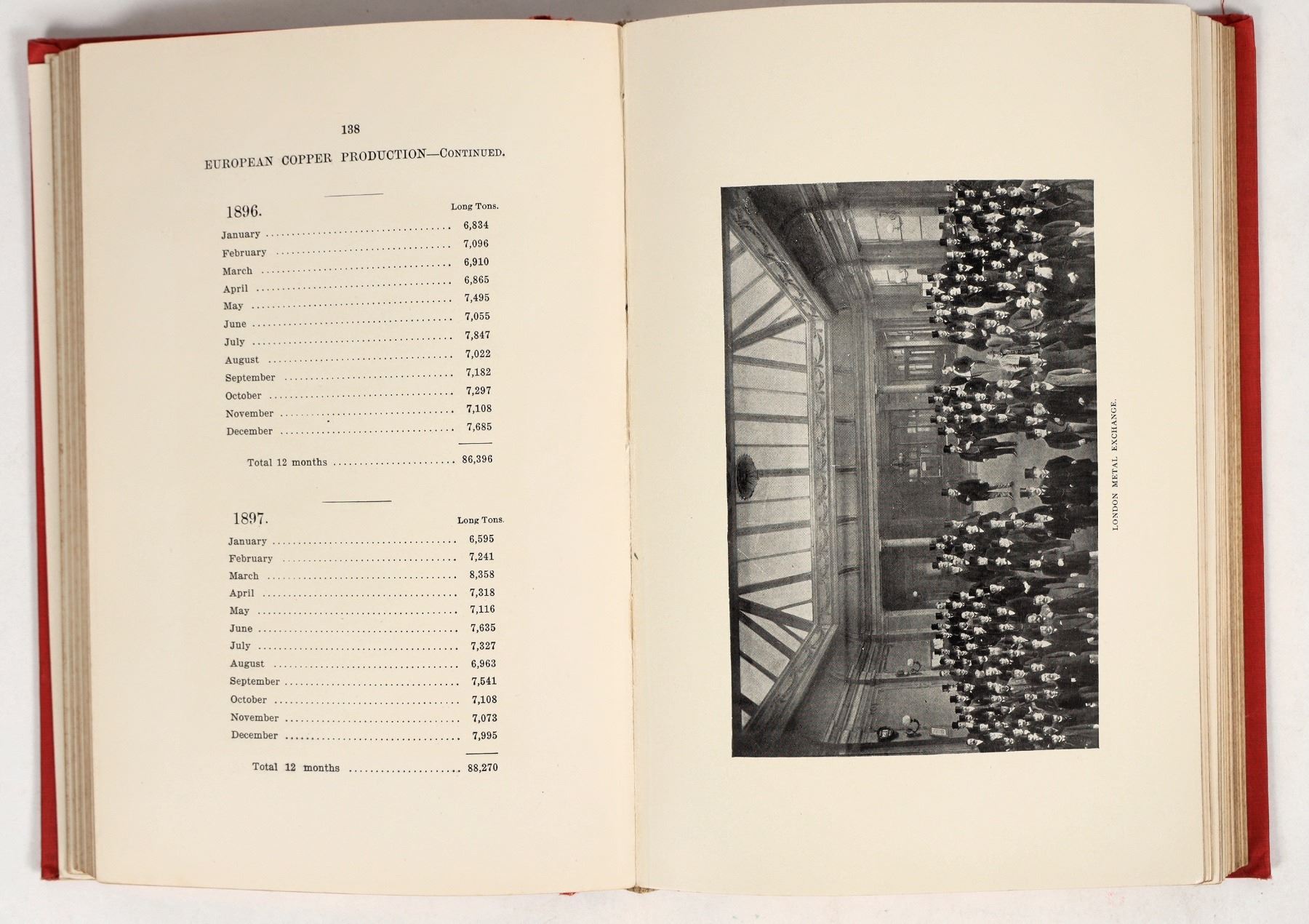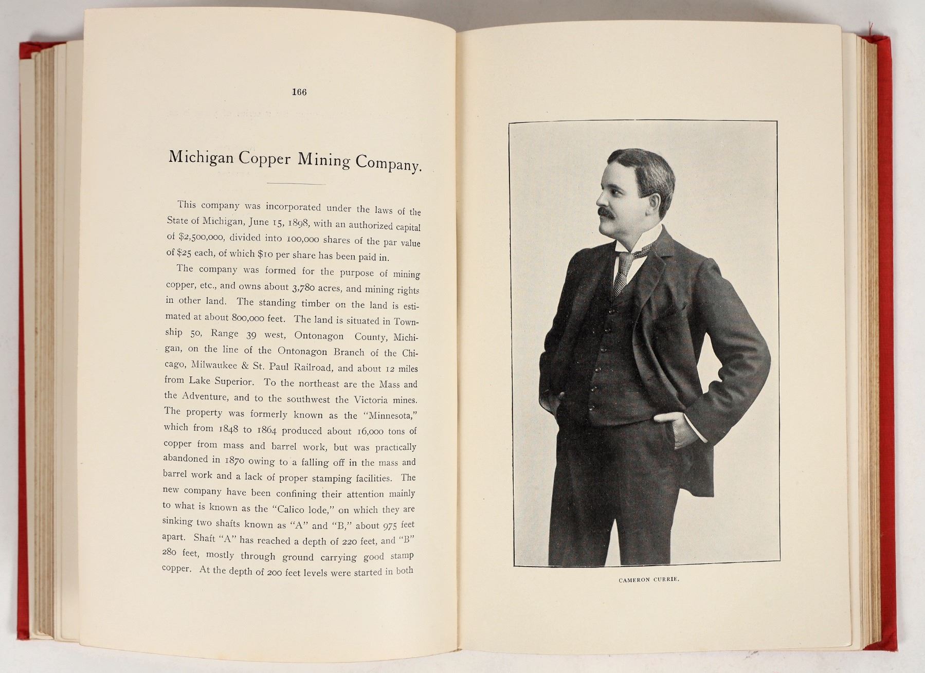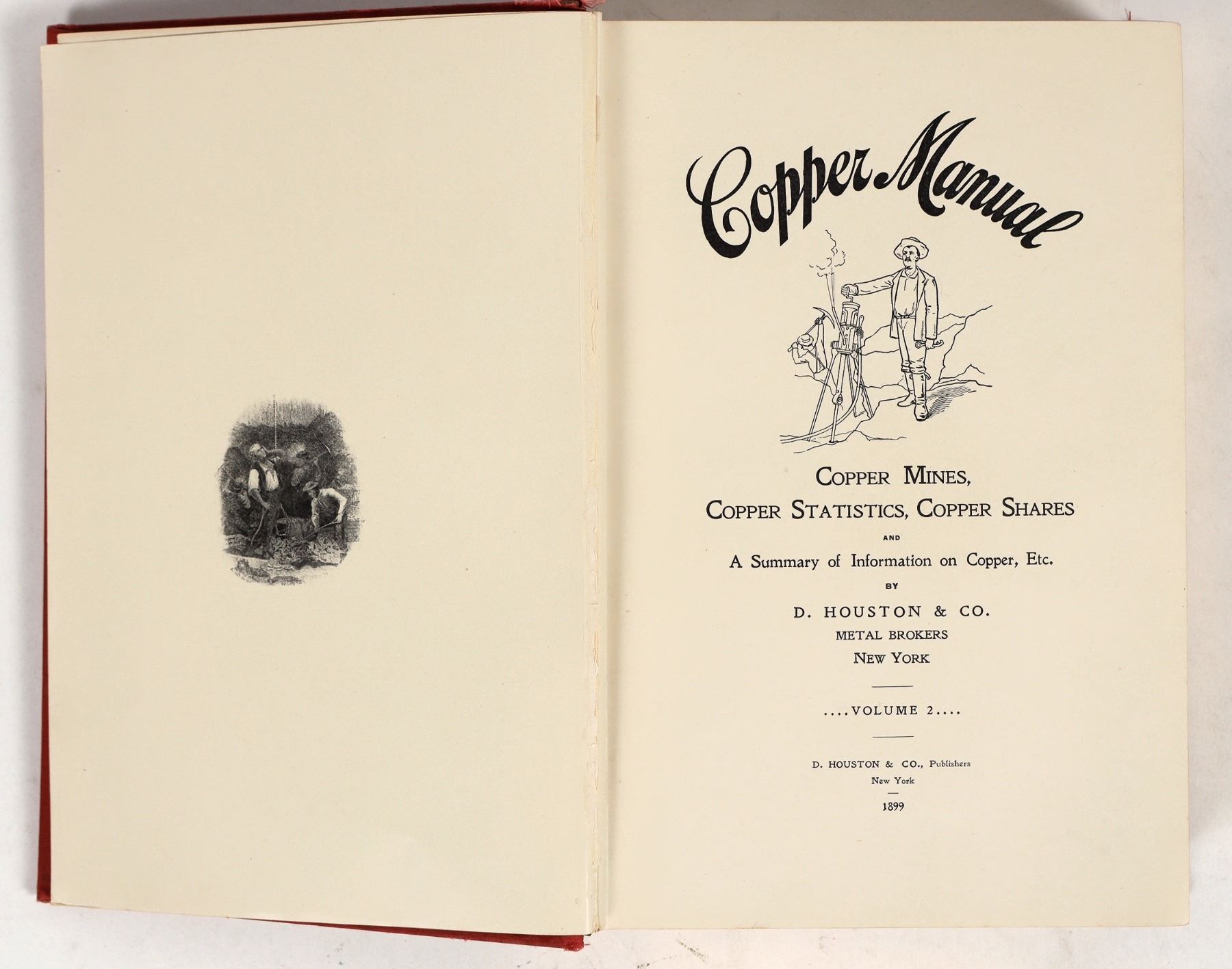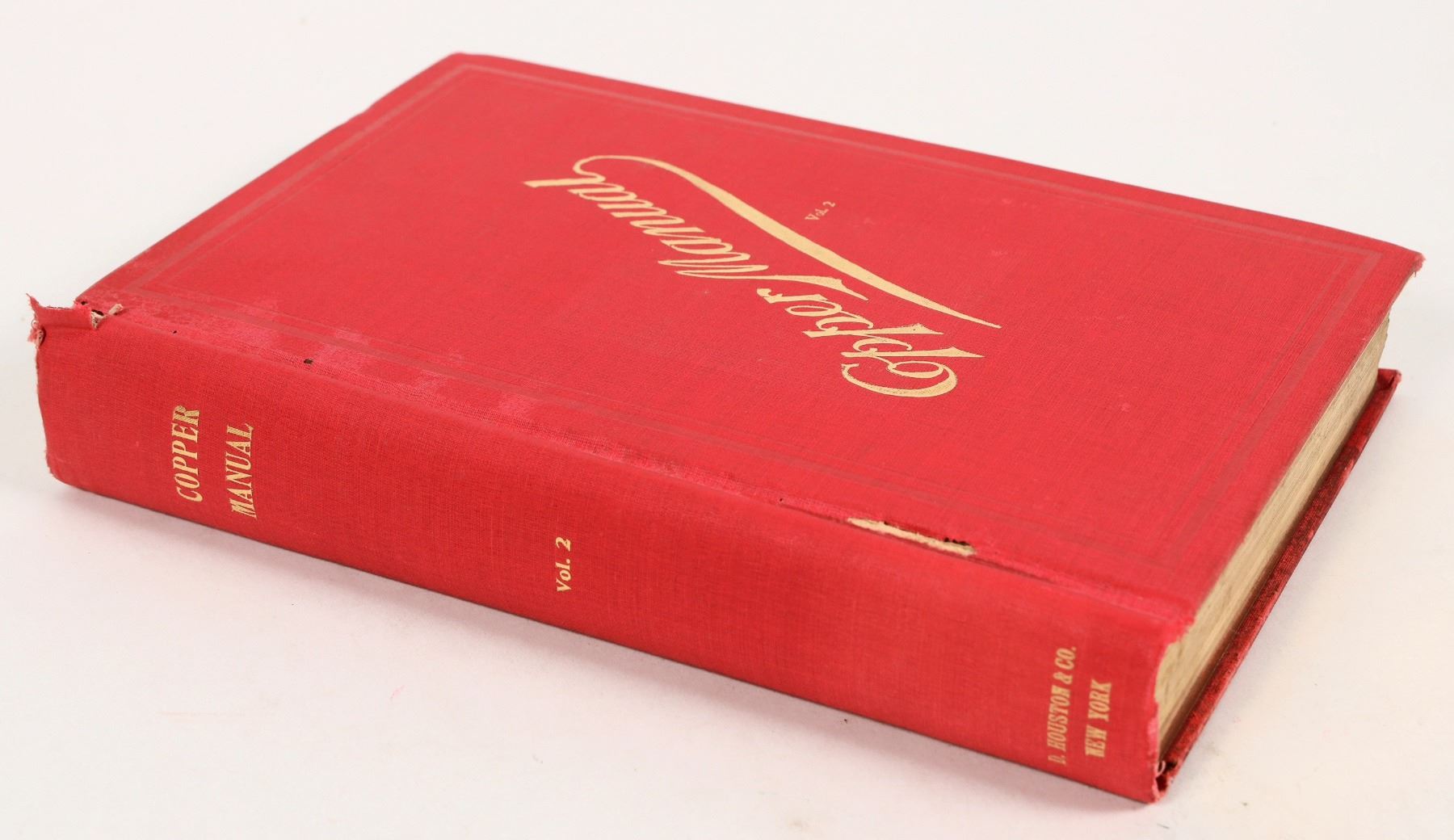 Copy of "Copper Manual: Copper Mines, Copper Statistics, Copper Shares and A Summary of Information on Copper, Etc.", Volume II, by D. Houston & Co. Metal Brokers of New York. Published 1899 by D. Houston & Company. Hardback, 398 pages (incl. 20 pages of ads at rear), original red fabric binding w/ gilt text and gilt page edges. Good condition, some damage to spine; see photos. 6.5"x9.5"x1.5".