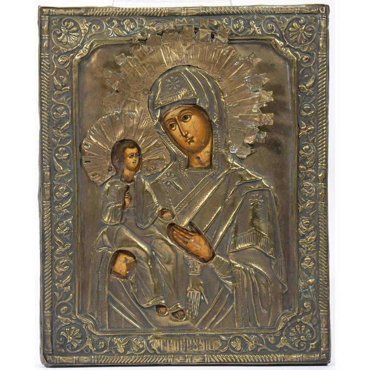 The figures having painted faces/hands, with nail-attached halos, surrounded by a scrolling leaf border. 8 3/4in. x 7in. Condition: Overall good; scratches and wear to paint, losses to border of large halo.