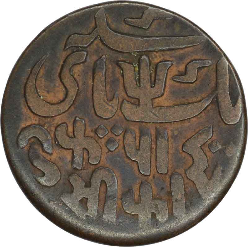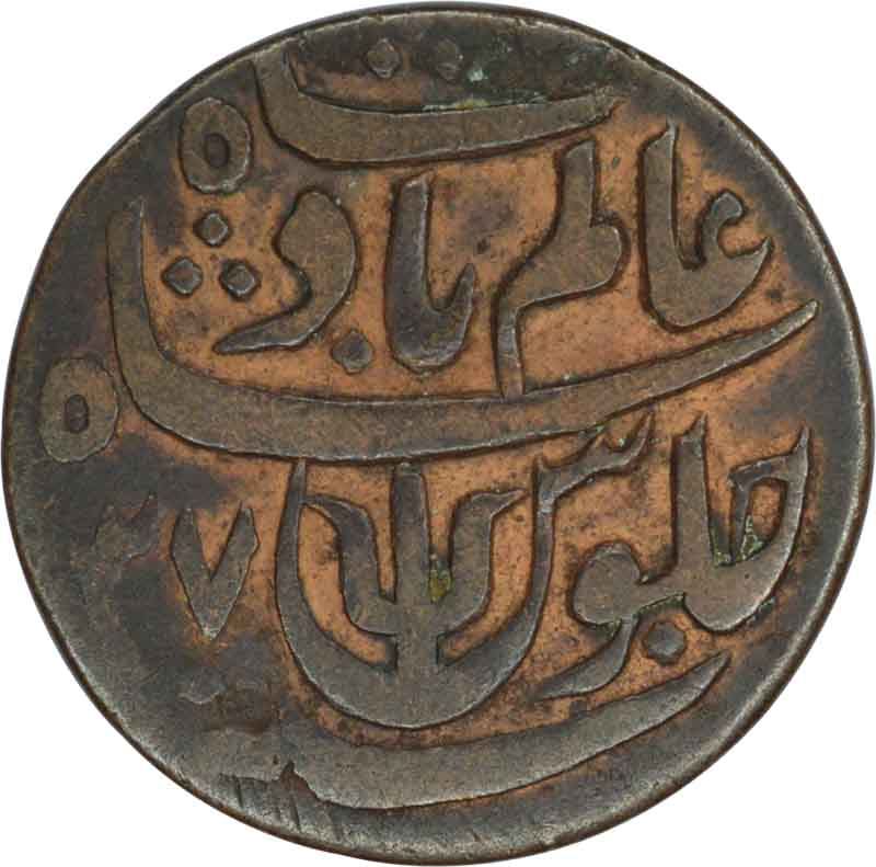 Bengal Presidency, Murshidabad, Copper One Pice, in the name of Shah Alam II, Obv: persian legend falus shah alam II, trisul (trident), Rev: legend with value in persian and hindi, persian mint, Edge: plain, Note: size varies: 22-26mm, thick letters many die varieties, 6.2g, 24.77mm, (KM# 27.3), about very fine.