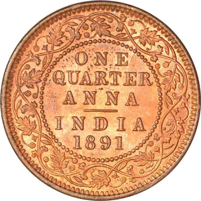Copper One Quarter Anna of Victoria Empress of Calcutta Mint of 1891.