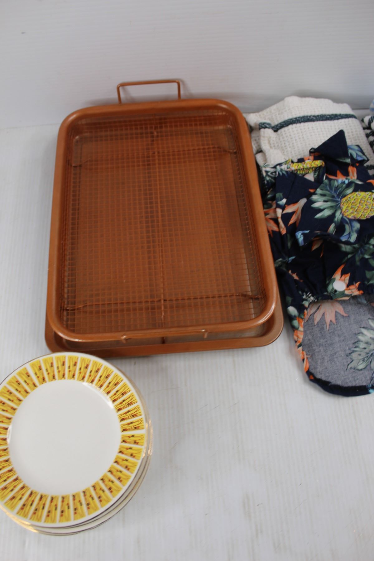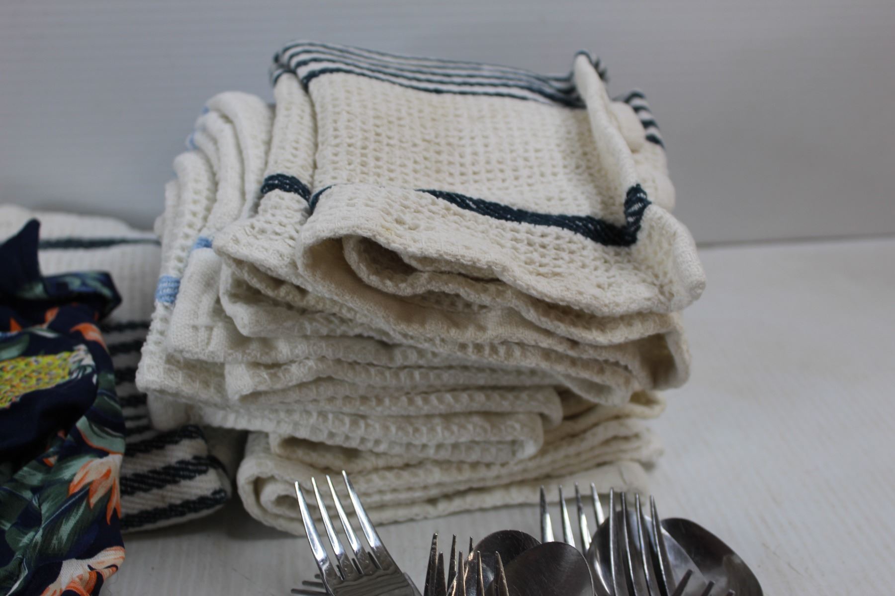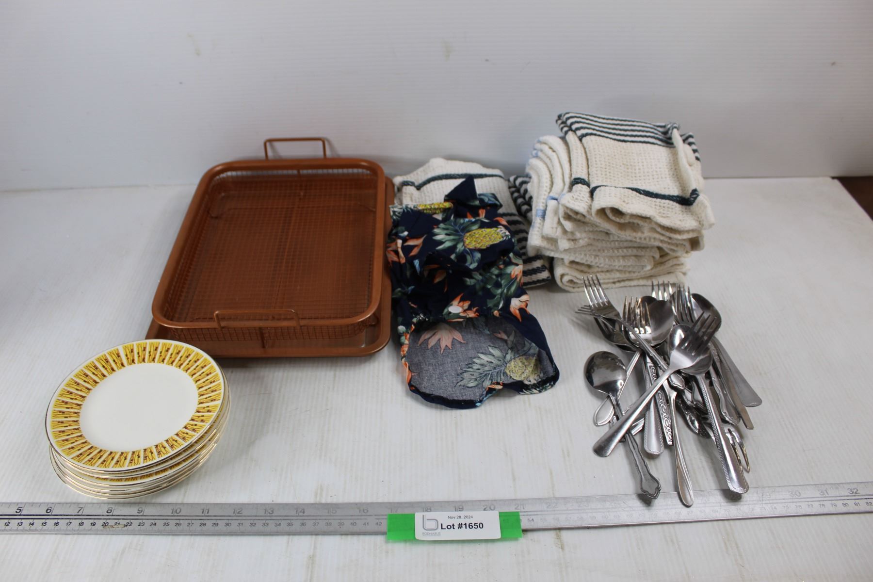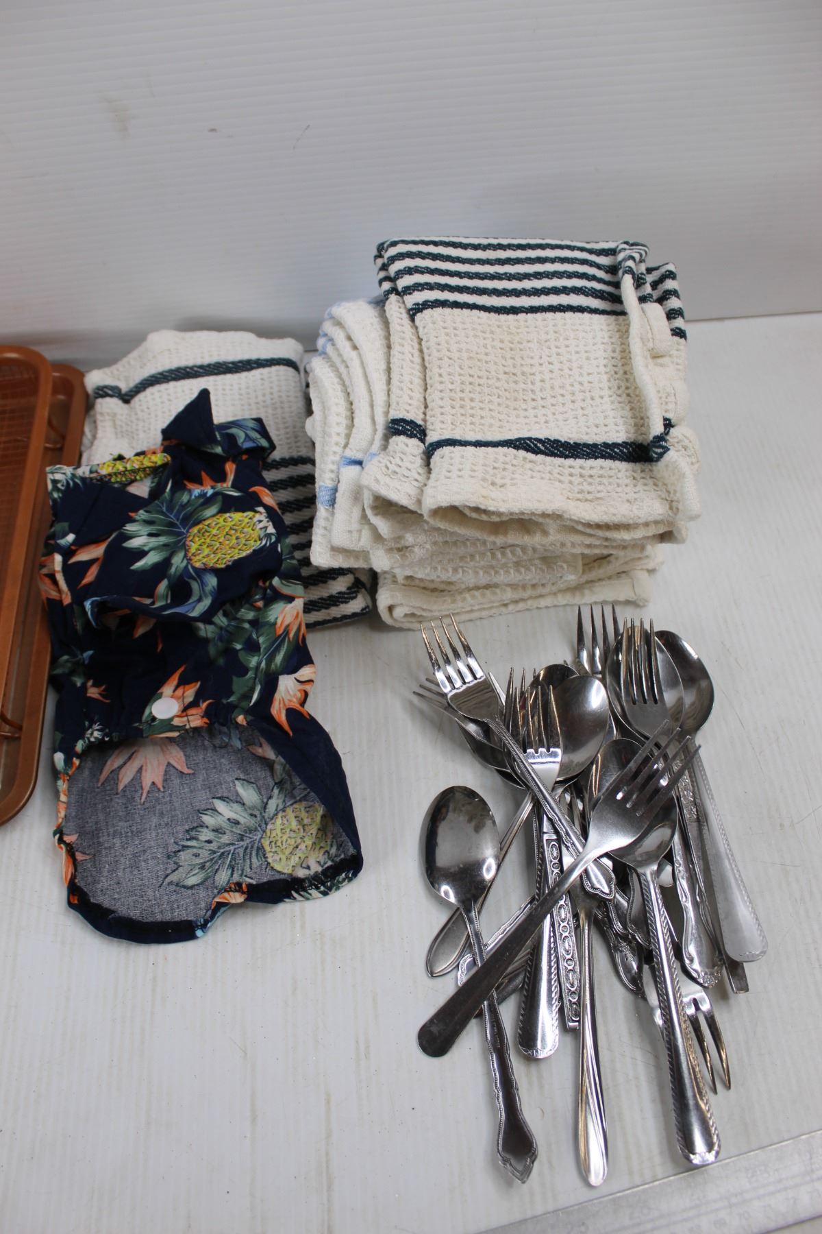 Copper Oven Pan w/ Bottom Tray, 9'' x 12'' , Various Tea Towels, (20) Various Forks & Spoons, Misc.