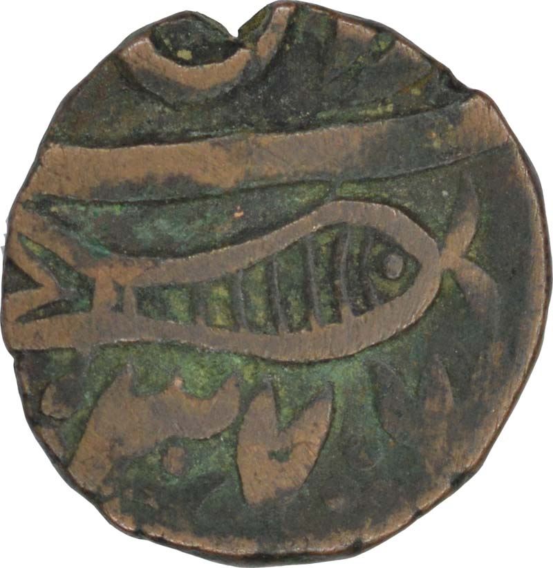 Maratha Confederacy, Akbarabad Mustaqir-al-Khilafat,Error Copper Paisa, In the name of Shah Alam II, Lakhi Type, fish mint mark, 5.10g, 18.82mm,(like KK Maheshwari# T3),about very fine, Rare.