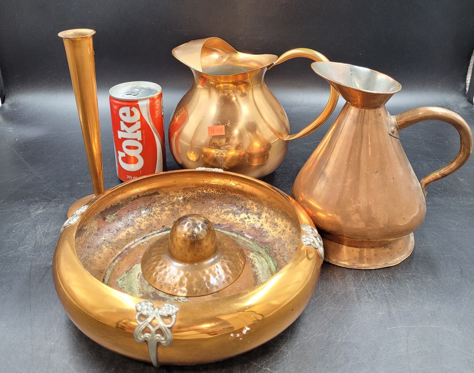 Copper Pitchers, Candleholder, and Dish