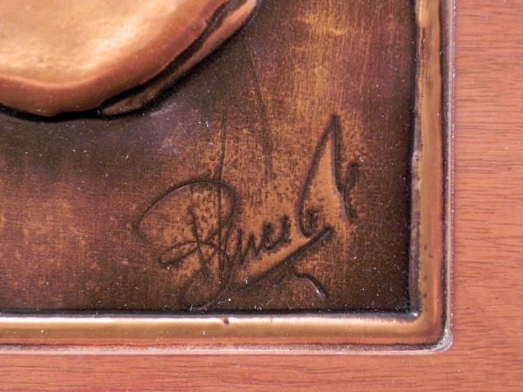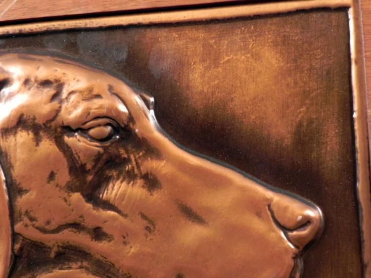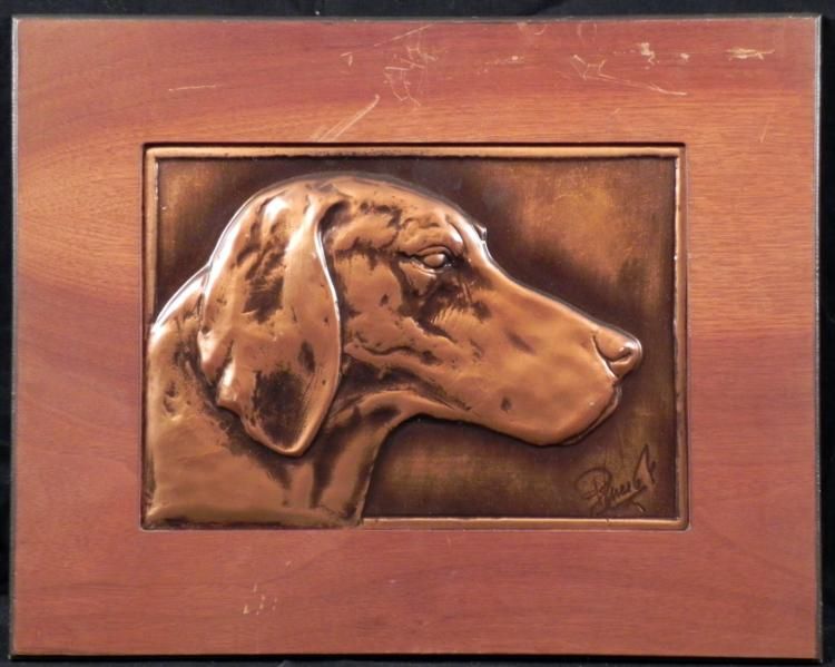 This is a German short hair pointer, looking very handsome in this relief image picture. * Artist: Signed, lower rightMedium: Copper plateImage size: 7 1/4 x 10 inchesFraming: Set in wooden frame and backingFrame size: 12 x 15 inchesCondition: Very good, with some scratches on the frame