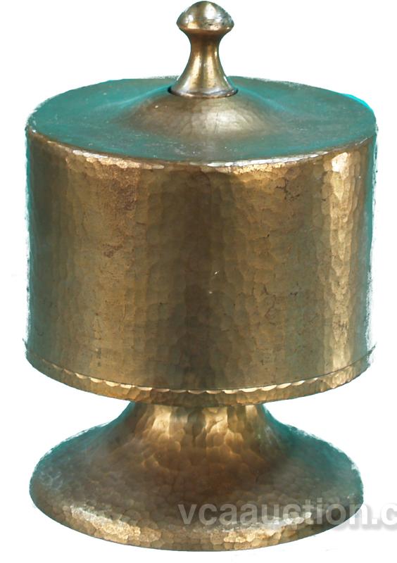 Copper Poker Caddy- Rare hand-hammered copper caddy with copper base, tip and cover; wooden 6 tube caddy for smaller size chips. Measures 4 1/2"D, 7" H; c1910-1920s. Probably mabe by the Roycrofters (www.roycroftcopper.com/other.htm) major players in the arts & Crafts movement around the begining of the 20th century. Very attractive and desirable.