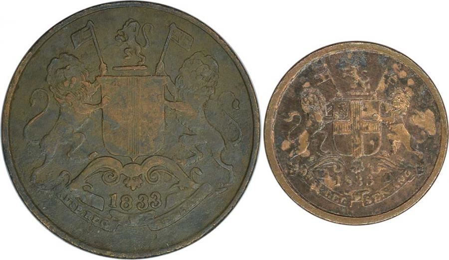Bombay Presidency, East India Company, Copper 1/4 Anna 1/12 Anna,1833 AD, 6.02g, 24.96mm 2.11g, 17.85mm, about fine.