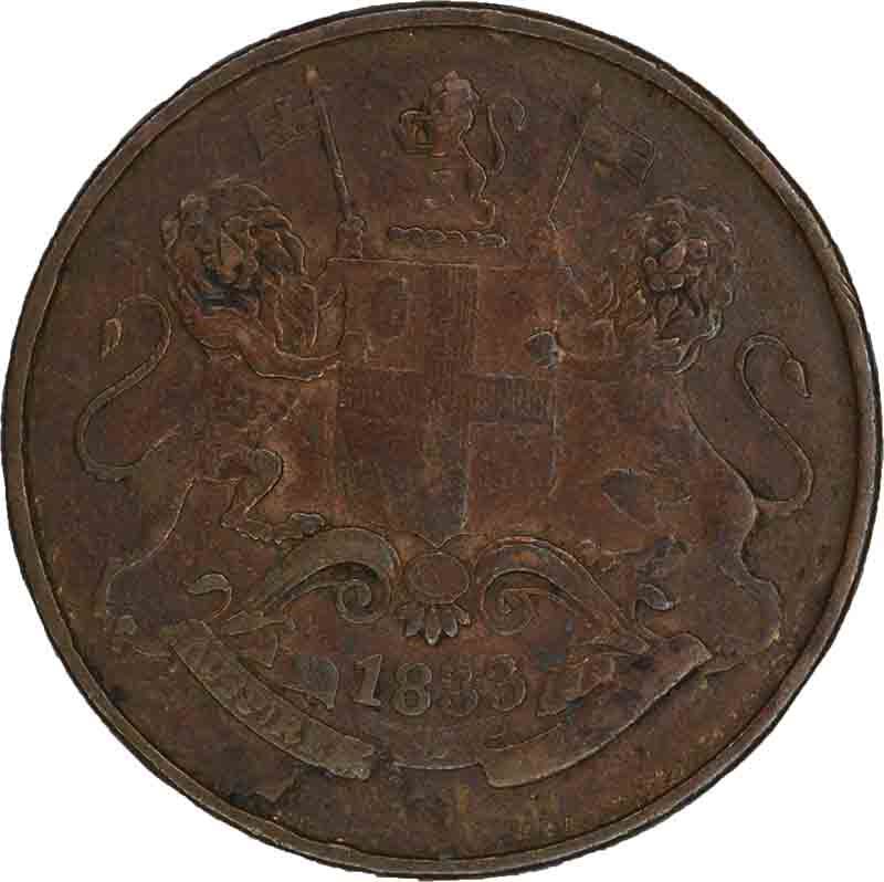 Bombay Presidency, Calcutta, Copper 1/4 Anna,1833/1249 AH, Obv: coat of arms, Rev:value in english, mezan-e-adal (scale of just), below hijri year, Edge: plain, 6.3g, 25.31mm, (KM# 232), about very fine.