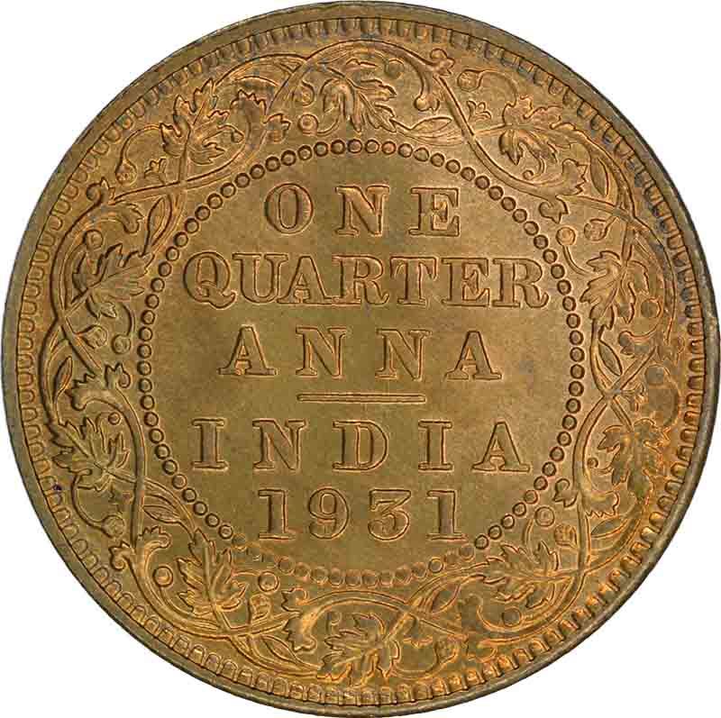 1931, King George V, Copper 1/4 Anna, Calcutta Mint, (PR # 672), UNC, Scarce.Similar condition coin was sold in our auction in September 2014 for 12,000 Rupees.