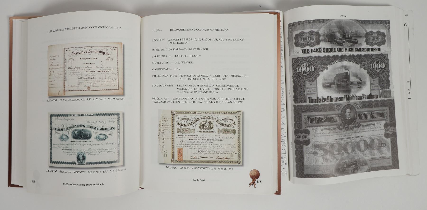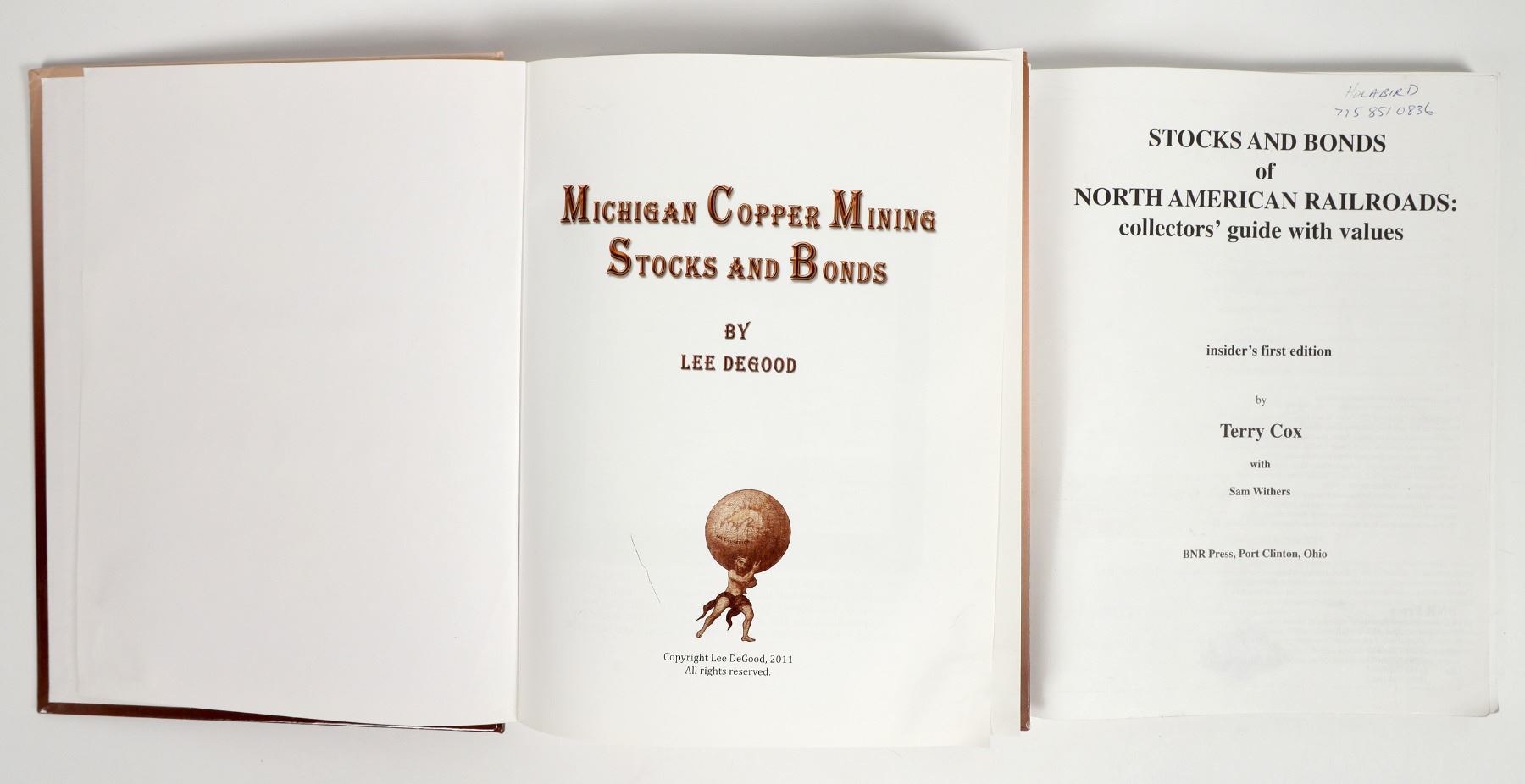 1) Michigan Copper Mining Stocks and Bonds by Lee DeGood. 2011. 2) Stocks and Bonds of Northern American Railroads: Collector's guide with values. Insider's first edition. by Terry Cox. 1995. Two more important reference works from Fred Holabird's research library. See photos for condition.