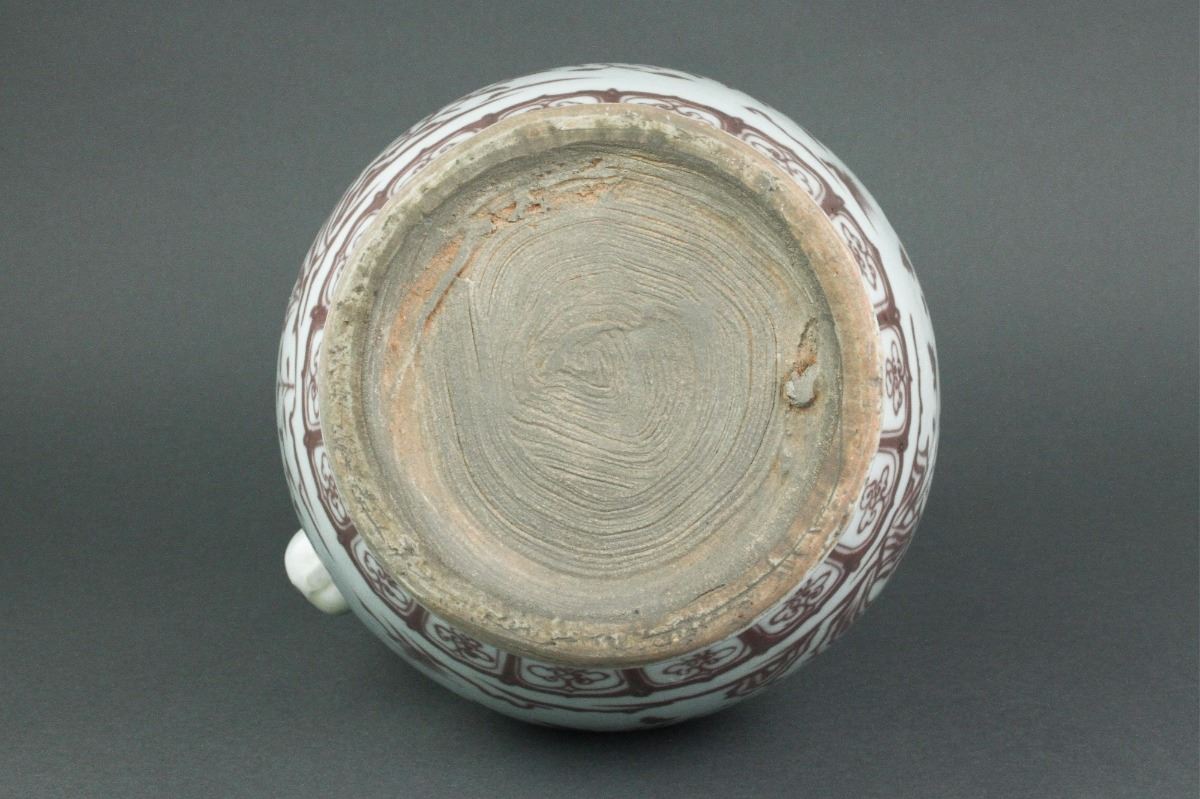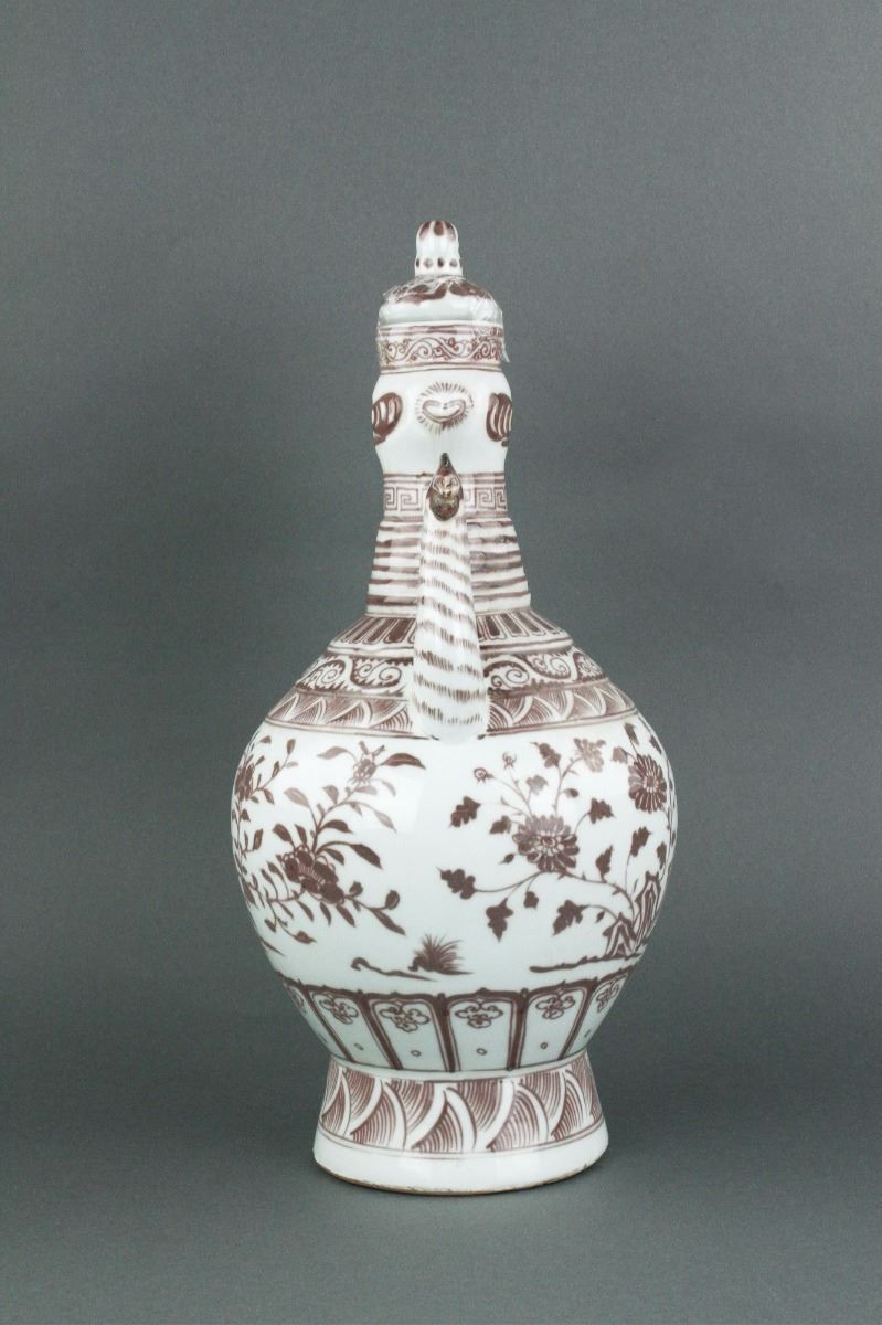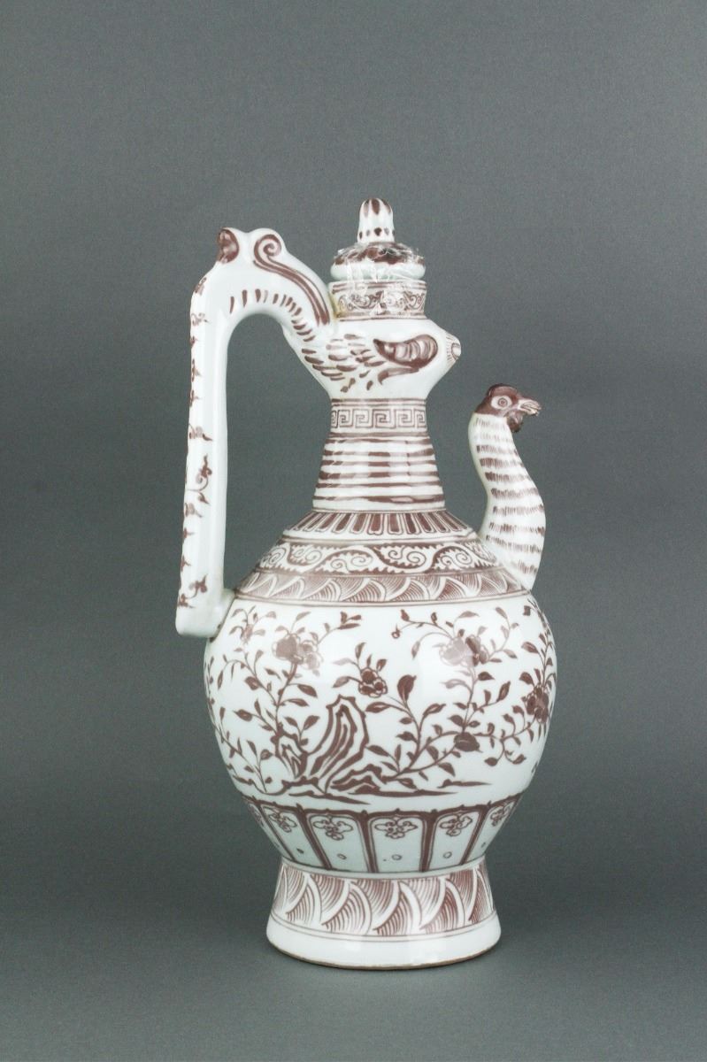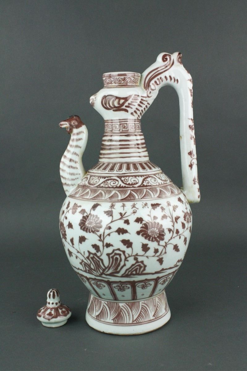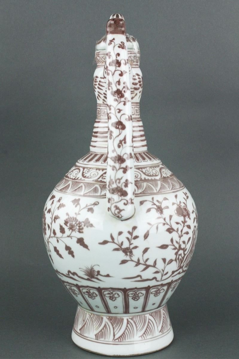 Chinese copper red porcelain ewer; of globular body with splayed foot rim and cylindrical neck; with ruyi-shaped handle and chicken-head-shaped spout; decorated with cluster of flowers; four-character Hongwu mark on body; unglazed base; H: 42 cm, D: 20 cm, 2946 grams