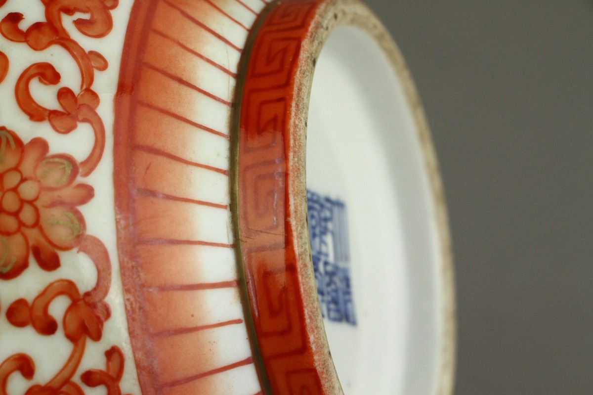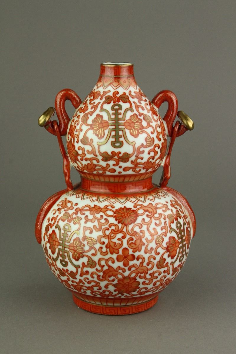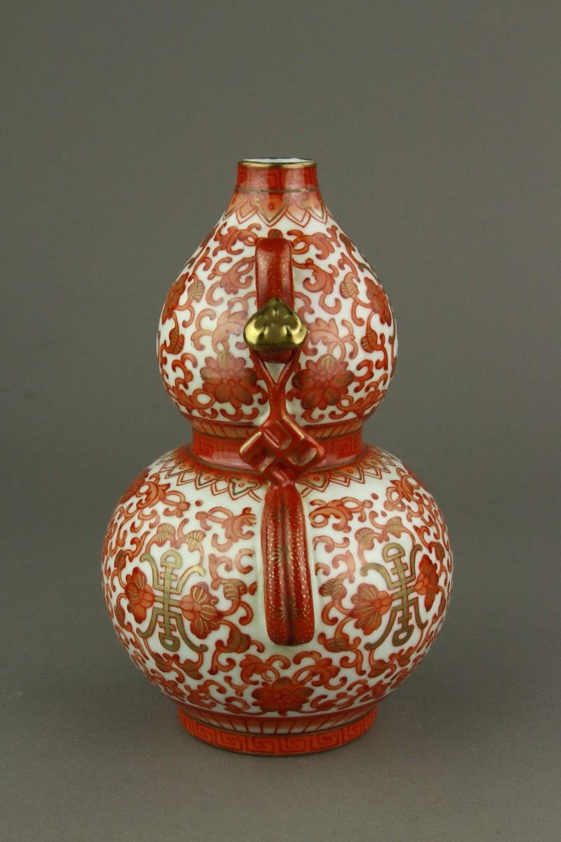 Chinese gilt copper red glazed porcelain vase; of double gourd body flanked by two ruyi-shaped ring handles; painted with Shou longevity symbol and lotus scrollwork; six-character Qianlong mark on base; H: 24 cm, D: 14 cm, 731 grams