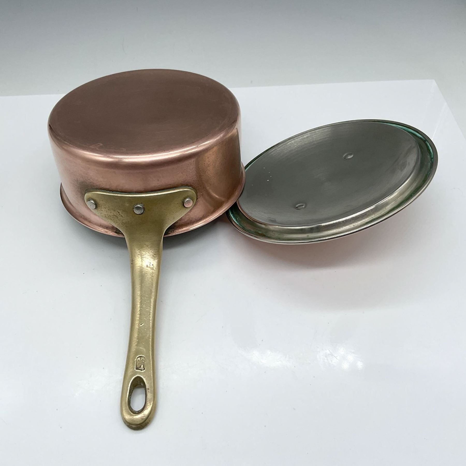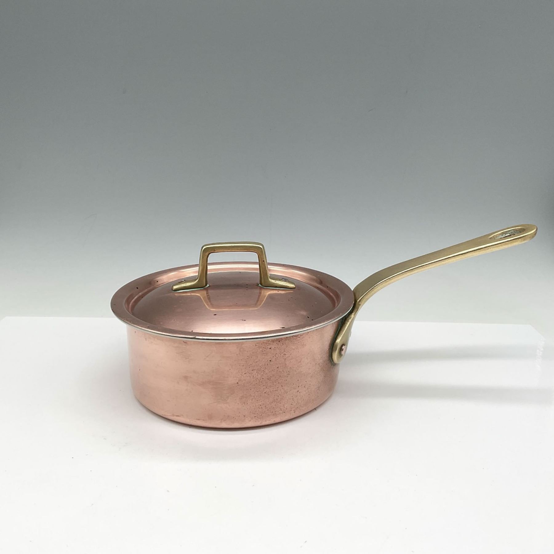 Lovely copper finish with matching lid. Brass handle on pan and on lid. Made in Korea impressed mark.