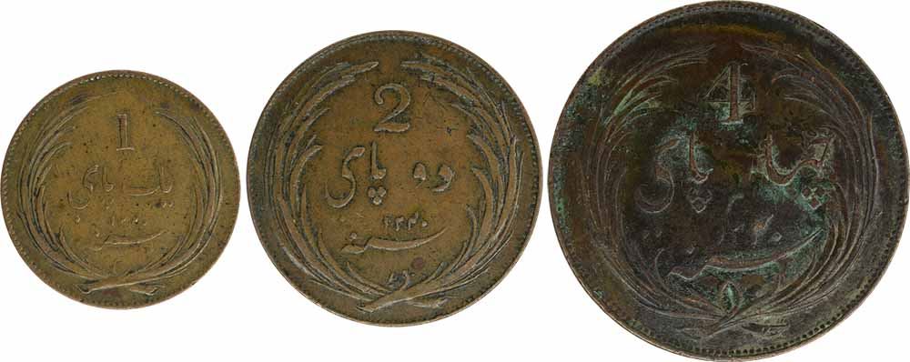 Madras Presidency, Copper, 1 pie, 2 pie and 4 pie, Obv: E.I.Co arms, Rev: value in persian, 2.15g, 17.98mm, 4.20g, 21.80mm 8.40g, 26.68mm,(KM# 428, 429 431),about very fine.