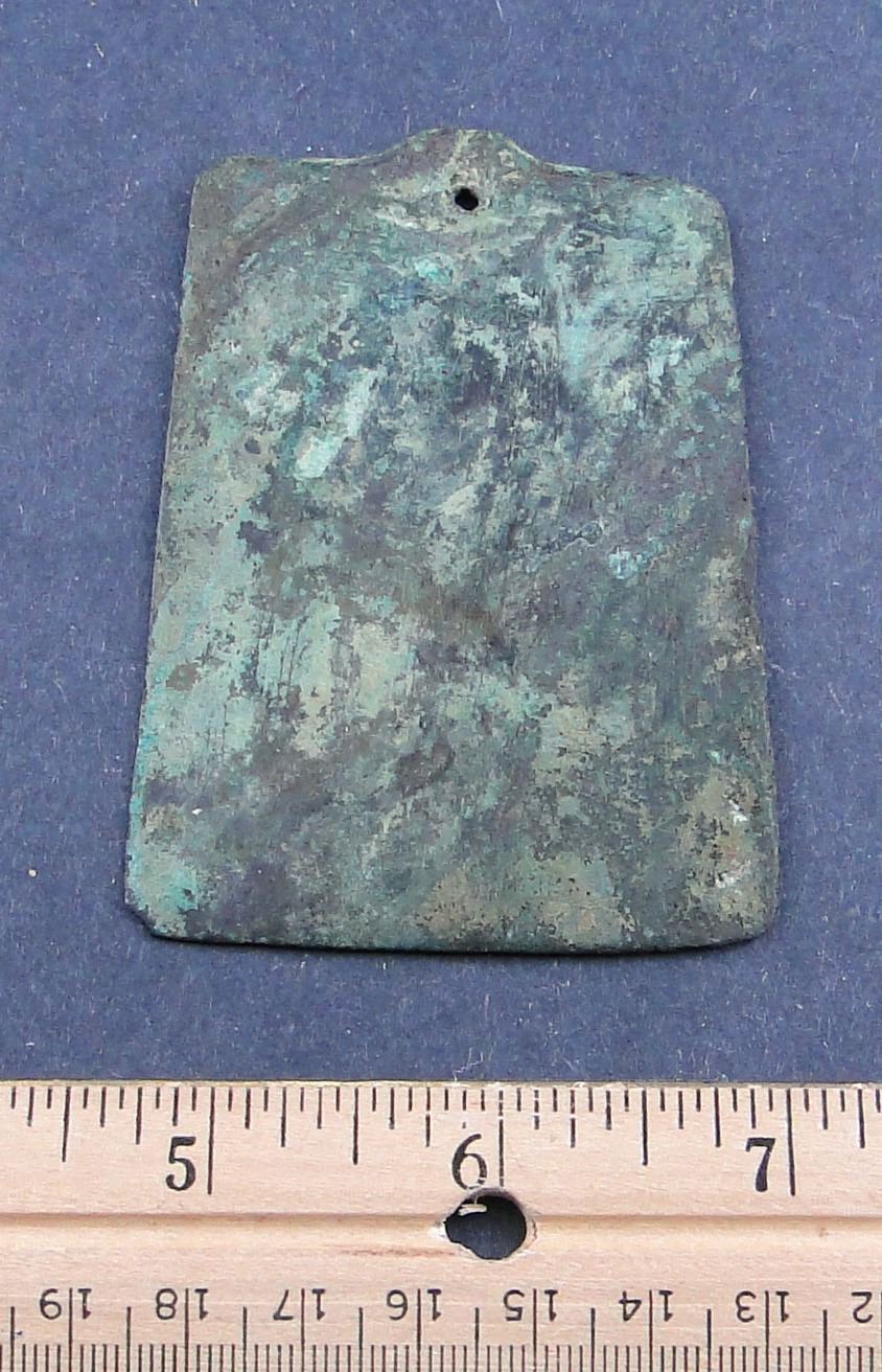 Description: The natives of Northwest Canada had a unique custom called potlatch: huge feasts were given at which a leading member of a tribe would distribute vast wealth. Copper shield money was given, and occasionally simply destroyed to show contempt by the potlatch giver, since he was so wealthy he could throw his money away. This is a copper shield fragment from such a potlatch. See Opitz, pp. 265-70 (this shield fragment illustrated on p. 268, top).