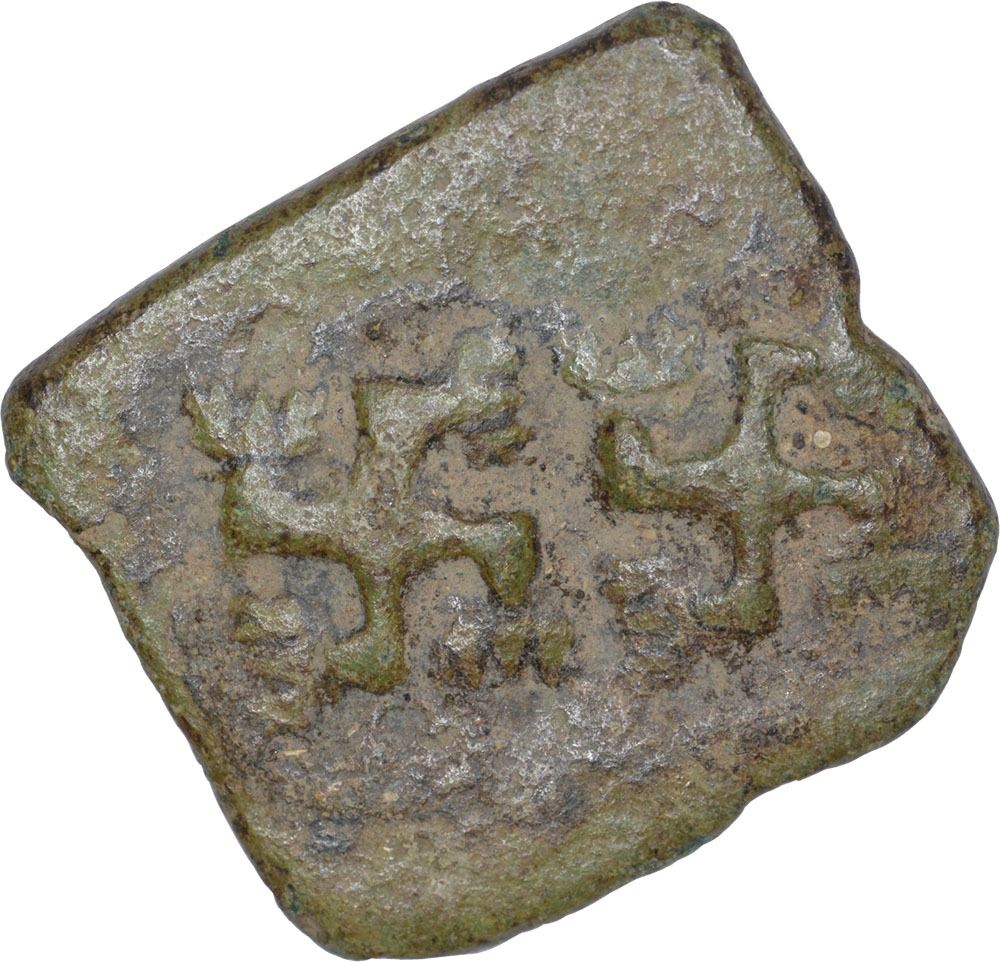 Satavahana Dynasty, Saurashtra (Gujarat), Copper Square Unit,Obv:two angularswastikaplaced side by side with the end-points having the form ofshrivatsasymbol,Rev: lord mahakal holding a staff (danda) and a water-pot (kamandalu) and a six-armed symbol,4.05g, 19.35x17.77mm, about very fine, Scarce.