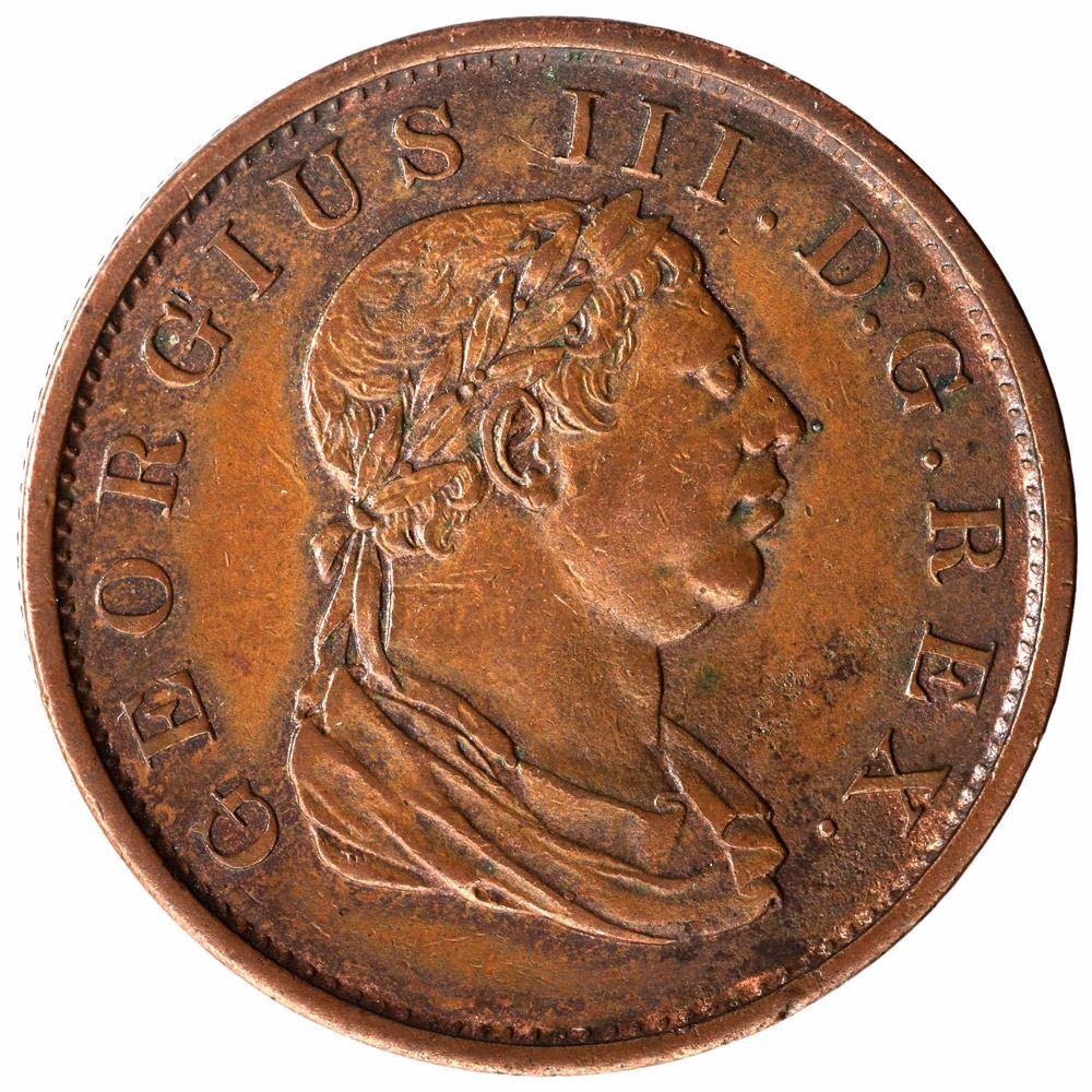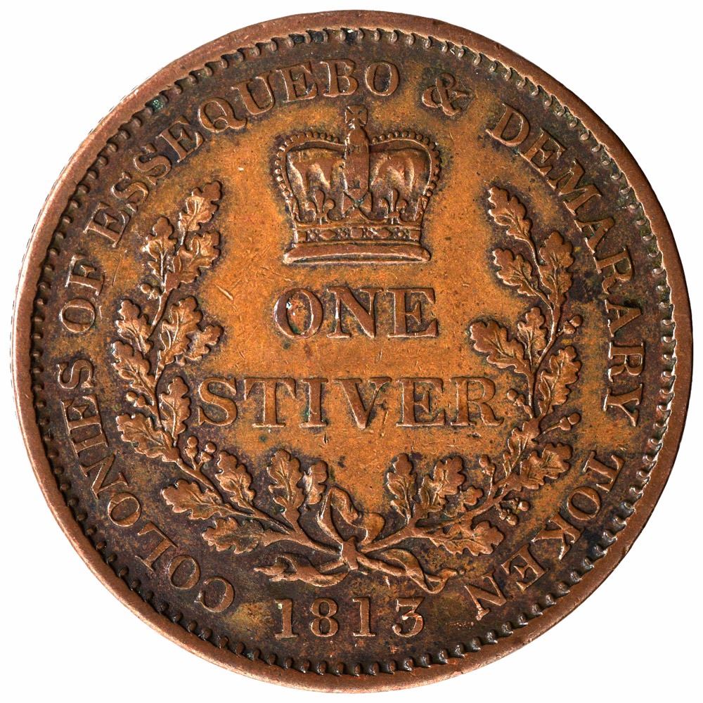 Demerara Essequibo, Copper Stiver,1813,Obv:kings draped bust facing right, with olive crown, legend almost all around the coin except for the base of the bust,Rev:face value in two words, crowned and surrounded by two oak branches tied together, legend all around the coin with date at bottom,18.78g, 33.98mm, about very fine.