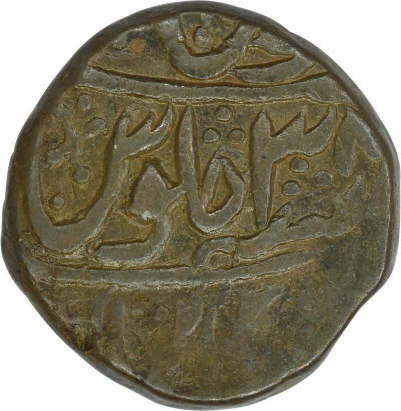 Maratha Confederacy, Ravishnagar Sagar, Copper Takka, Obv:persian legend, trident three petal flower, Rev:manus maimanat sanah 38 julus zarb ravishnagar sagar, 13.73g, 20.92mmm,( Maheshwari Wiggins T5), aboutextremely fine, Very Rare.