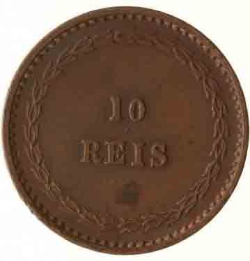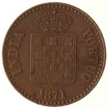 India-Portuguese, Luiz I, Copper10 Reis, 1871 Obv:crowned arms,Rev:value within wreath,18.80mm, (KM# 303),about extremely fine, Scarce.