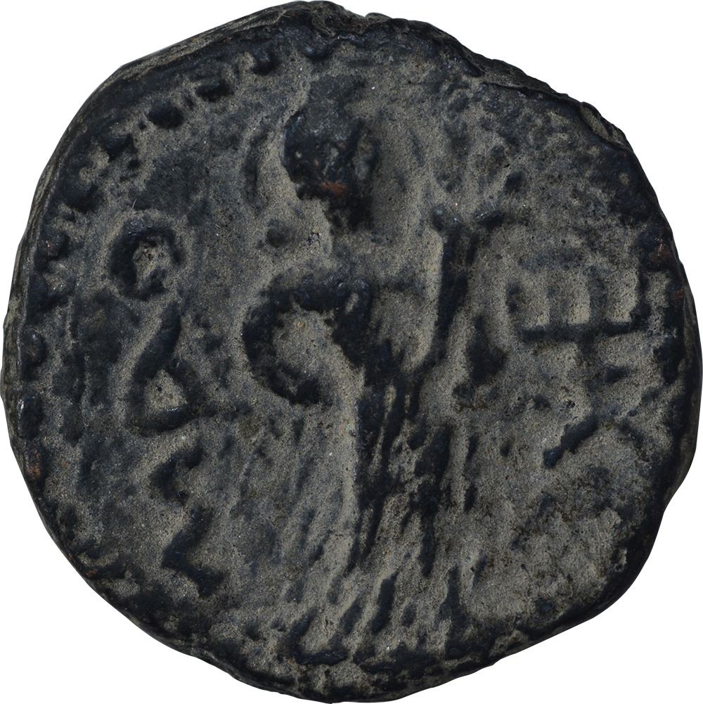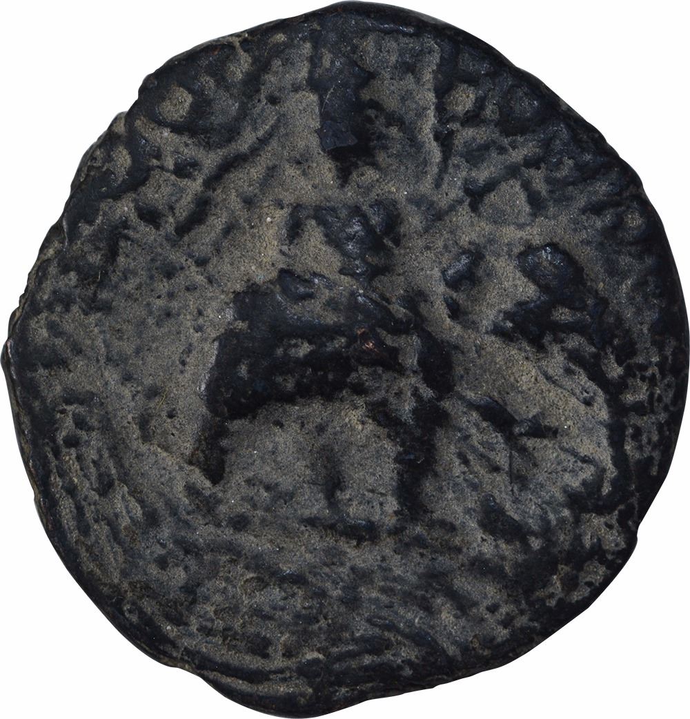 Kushan Dynasty, Huvishka, Copper Tetra Drachma,Moon God (Mao) Type, Obv: king riding right, holding elephant goad, bactrian legend around, Rev: goddess of plenty ardoksho standing right, holding bowl and corcucopia, bactrian legend at left Mao, tamgha at right, 9.41g,24.24mm, about very fine, Rare.
