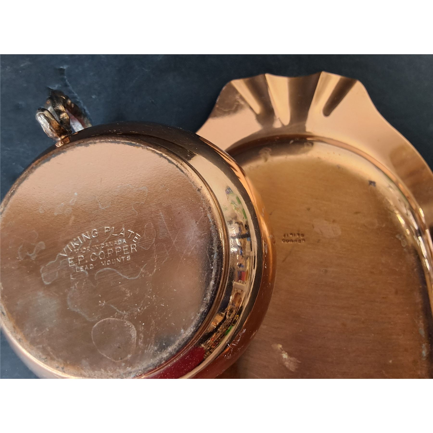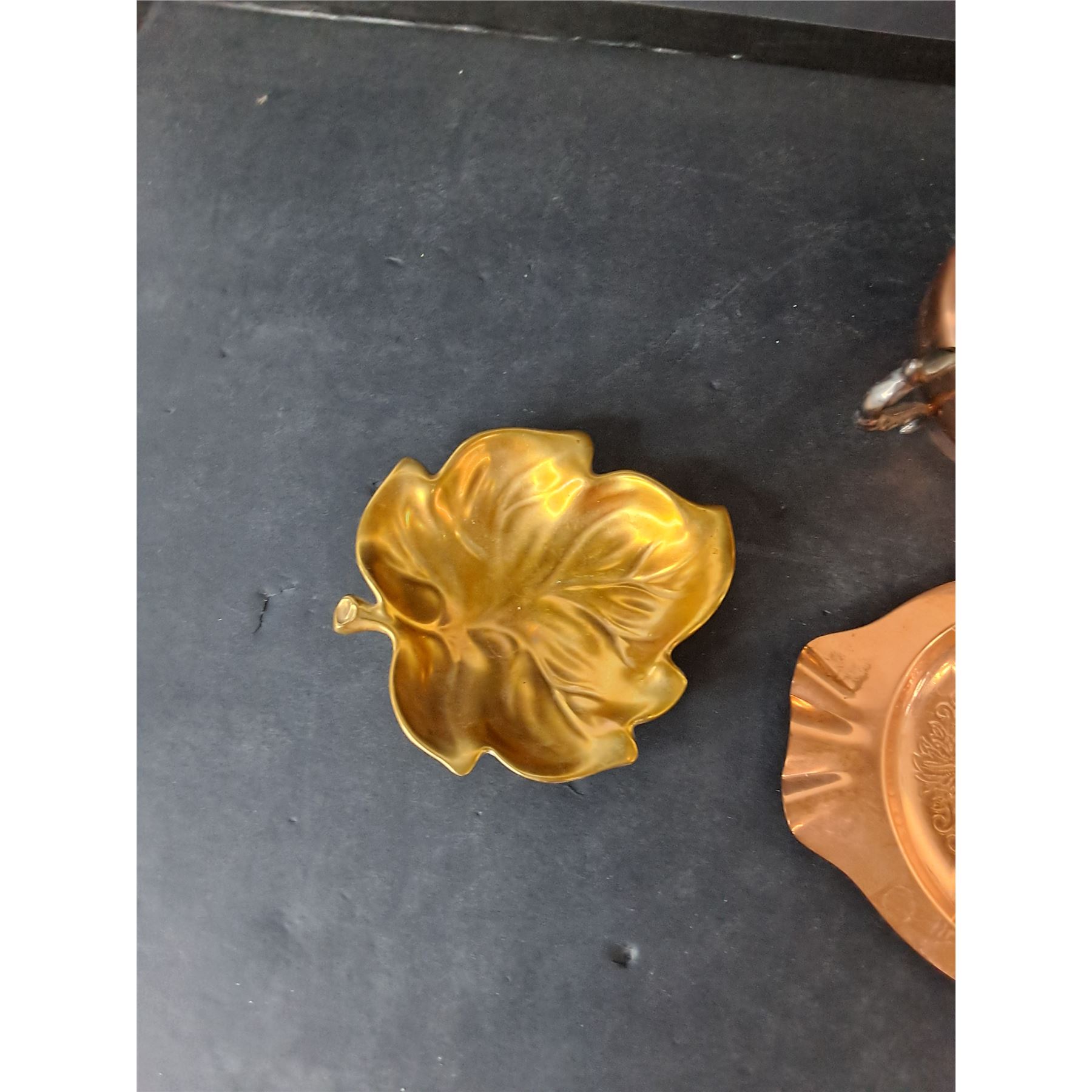 Copper Tray & Electroplated Copper Sugarbowl, Creamer & Ceramic Catchall