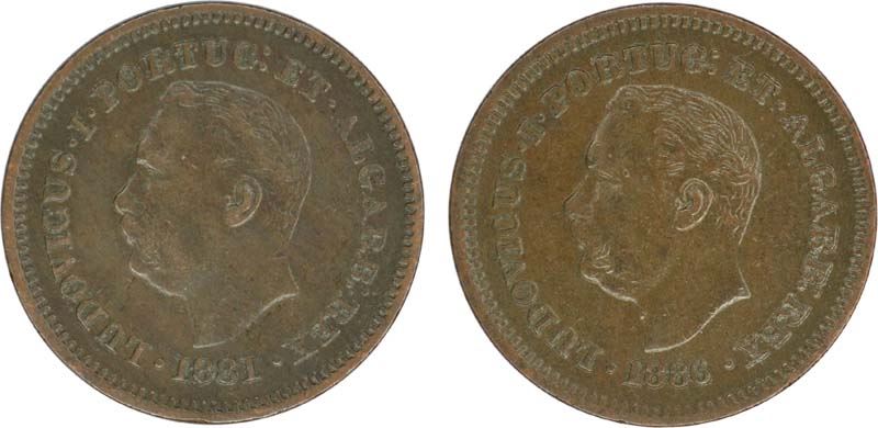 India-Portuguese, Ludovicous I, Copper Unit (2), 1/8 Tanga,1881 1886,Obv:king profile bust left, Rev:crown in centre, denomination below, 3.26g, 21.31mm 3.20g, 21.14mm,(KM# 307),about very fine+.