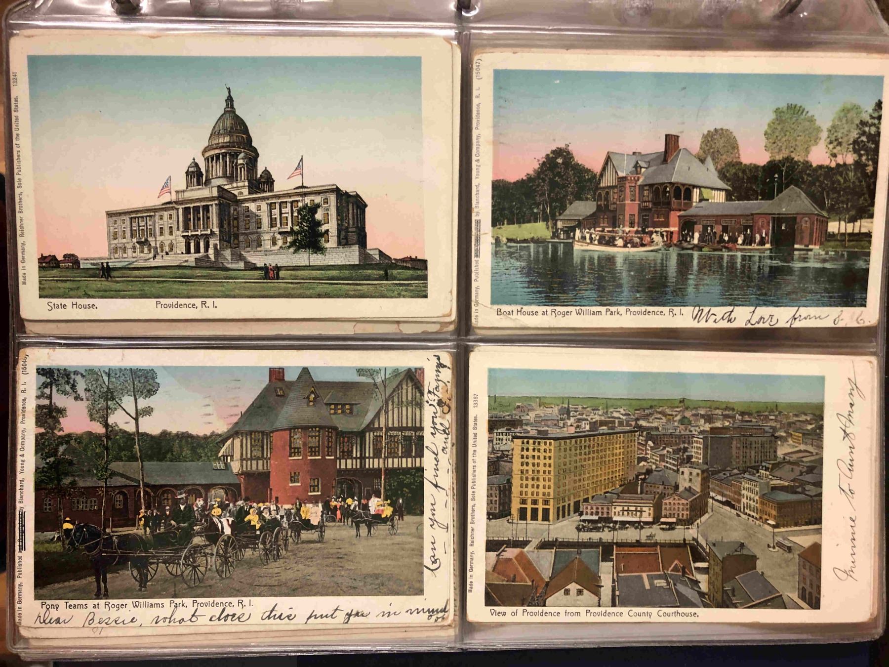 Album of over 140 copper window postcards. Many cards have wear and fragile. Mainly New England states.