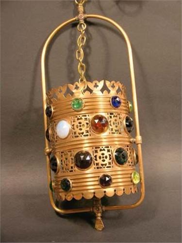 Copper & brass jewel studded hanging lamp, approximately 12" tall, ex. cond. Works.