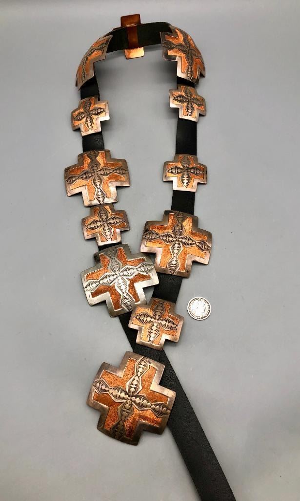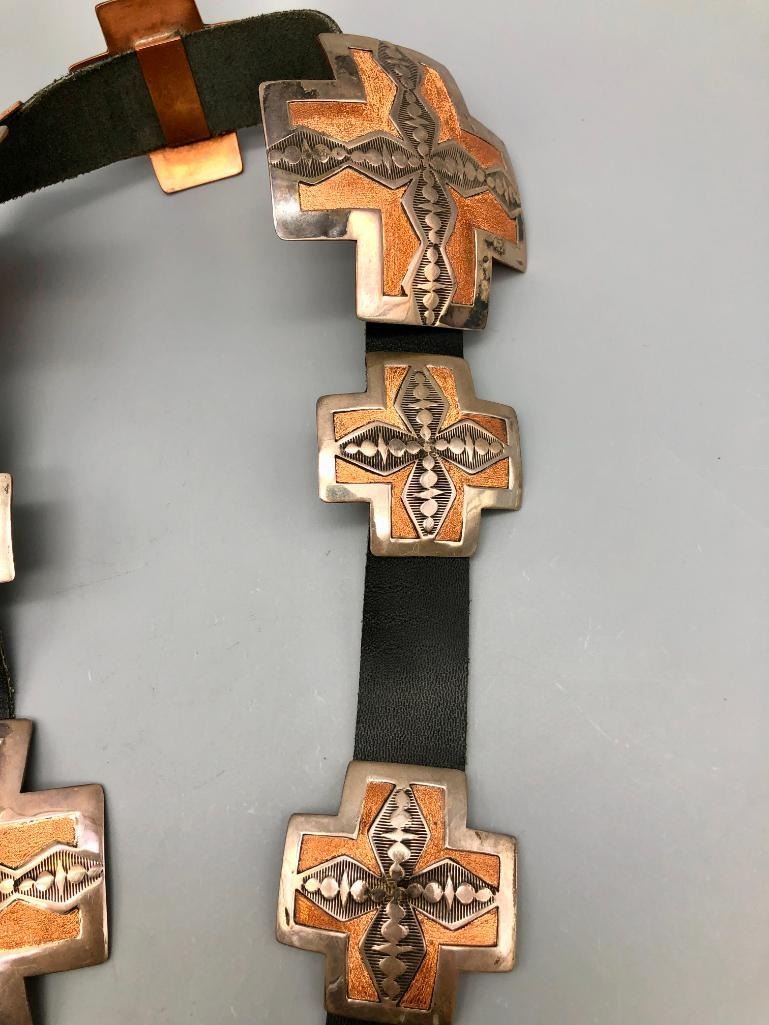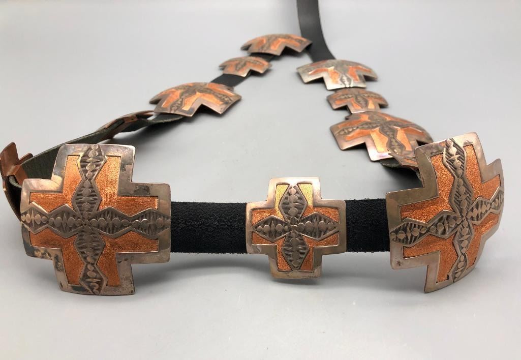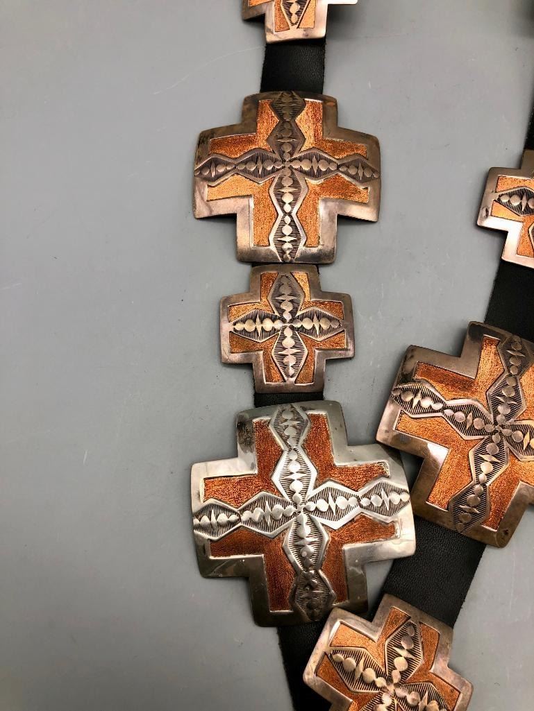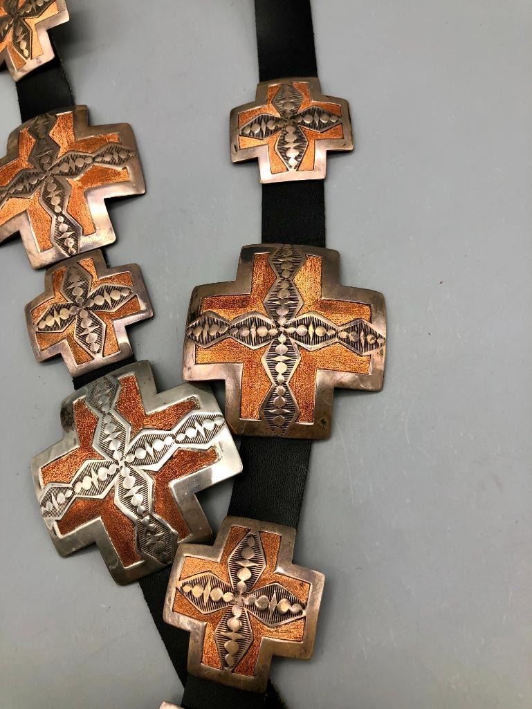 For your consideration we offer this copper and sterling silver concho belt. It features two different sized conchos in the shape of crosses. They are on a black leather belt in nice condition. MAKER: Douglas Etsitty, Navajo. APPROX AGE: C. 2000s. SIZE: Larger concho measures 3-1/8 inches x 3-1/8 inches, smaller concho measures 2-1/8 inches x 2-1/8 inches with an overall length of 47-1/4 inches. Weighs 463.6 grams. CONDITION: Good, minimal wear expected. Please look closely at the pictures as they are an important part of our description and are hereby incorporated into the description, specifically with regards to condition. SHIPPING: There will be a $5 handling / packaging fee for shipping this lot. The actual cost of postage will be added on top of that. BUY IT NOW: If you would like to buy this item now, without waiting for the auction day to bid on it, we do offer this option (which is available up to 48 hours before the actual auction starts). The “Buy it Now†price is the high estimate of this lot (plus applicable fees and the Buyer's premium is discounted to 10% when using the Buy it Now option). If you would like to exercise this option, you must contact us by email (or phone as long as you talk to someone live). Reference this lot number and your intention to "Buy it Now."