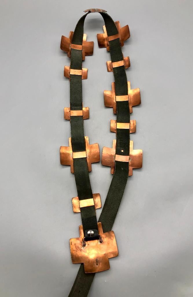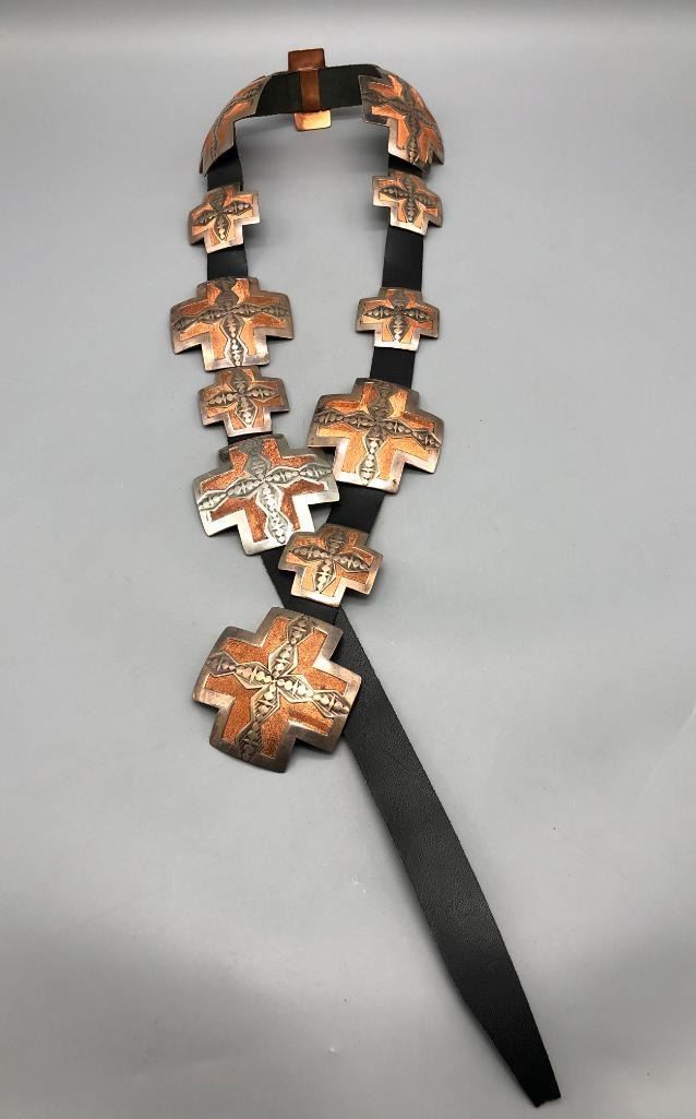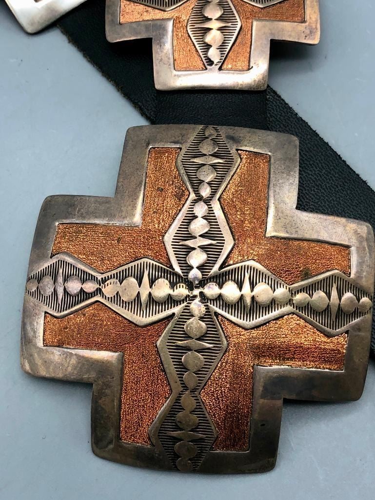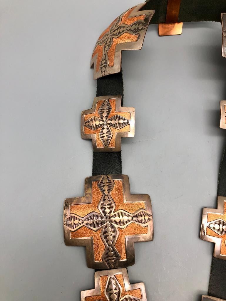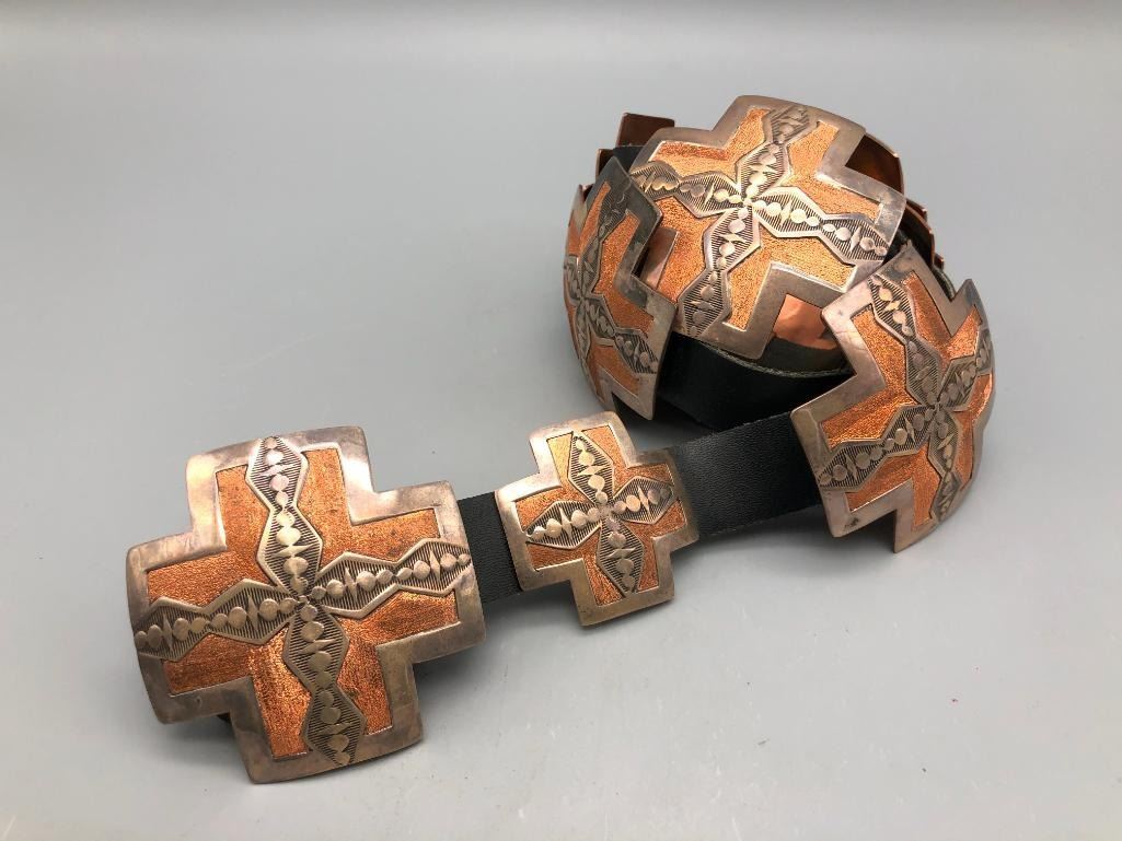 For your consideration we offer this copper and sterling silver concho belt. It features two different sized conchos in the shape of crosses. They are on a black leather belt in nice condition. MAKER: Douglas Etsitty, Navajo. APPROX AGE: C. 2000s. SIZE: Larger concho measures 3-1/8 inches x 3-1/8 inches, smaller concho measures 2-1/8 inches x 2-1/8 inches with an overall length of 47-1/4 inches. Weighs 463.6 grams. CONDITION: Good, minimal wear expected. Please look closely at the pictures as they are an important part of our description and are hereby incorporated into the description, specifically with regards to condition. SHIPPING: There will be a $5 handling / packaging fee for shipping this lot. The actual cost of postage will be added on top of that. BUY IT NOW: If you would like to buy this item now, without waiting for the auction day to bid on it, we do offer this option (which is available up to 48 hours before the actual auction starts). The “Buy it Now†price is the high estimate of this lot (plus applicable fees and the Buyer's premium is discounted to 10% when using the Buy it Now option). If you would like to exercise this option, you must contact us by email (or phone as long as you talk to someone live). Reference this lot number and your intention to "Buy it Now."