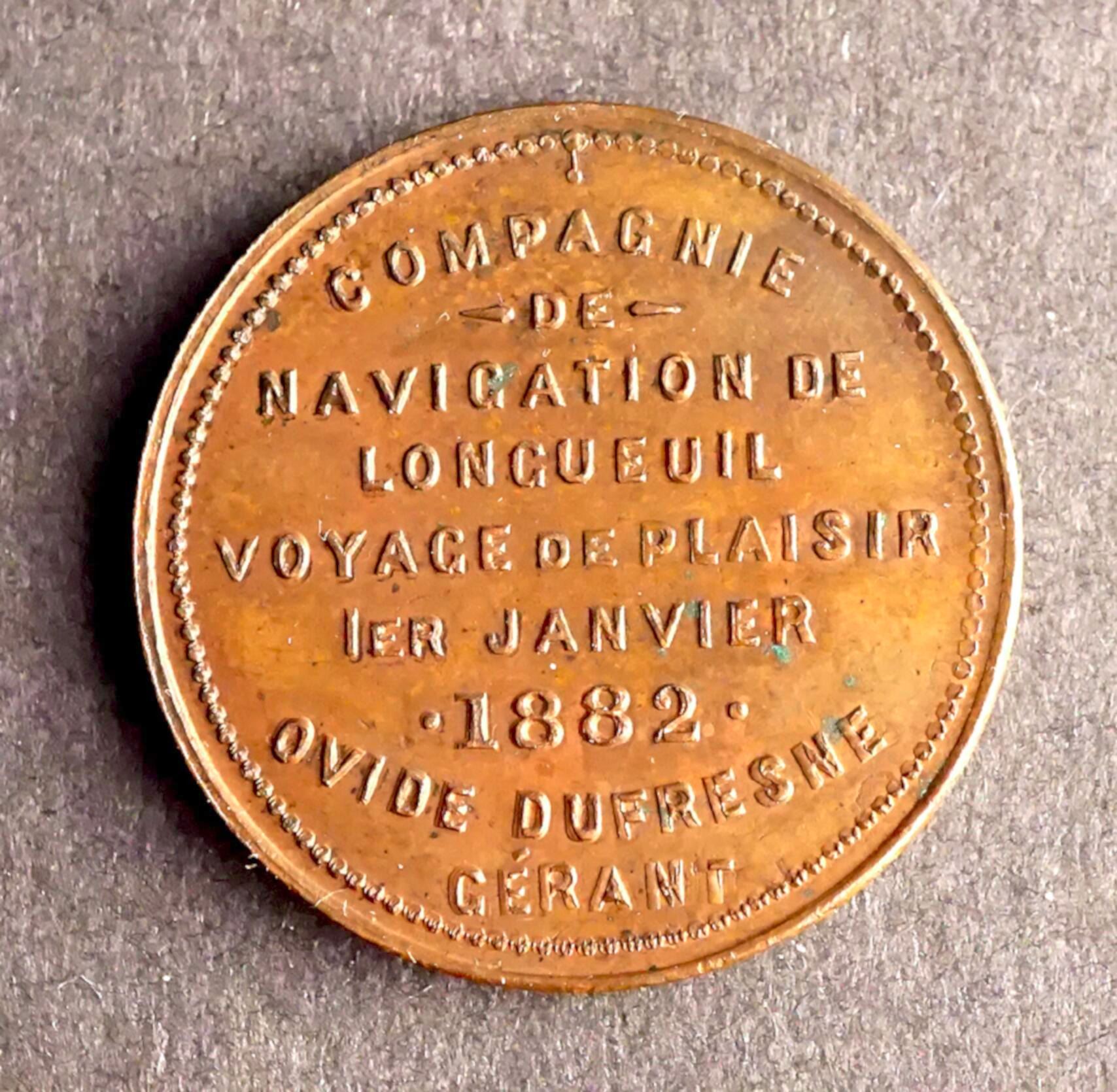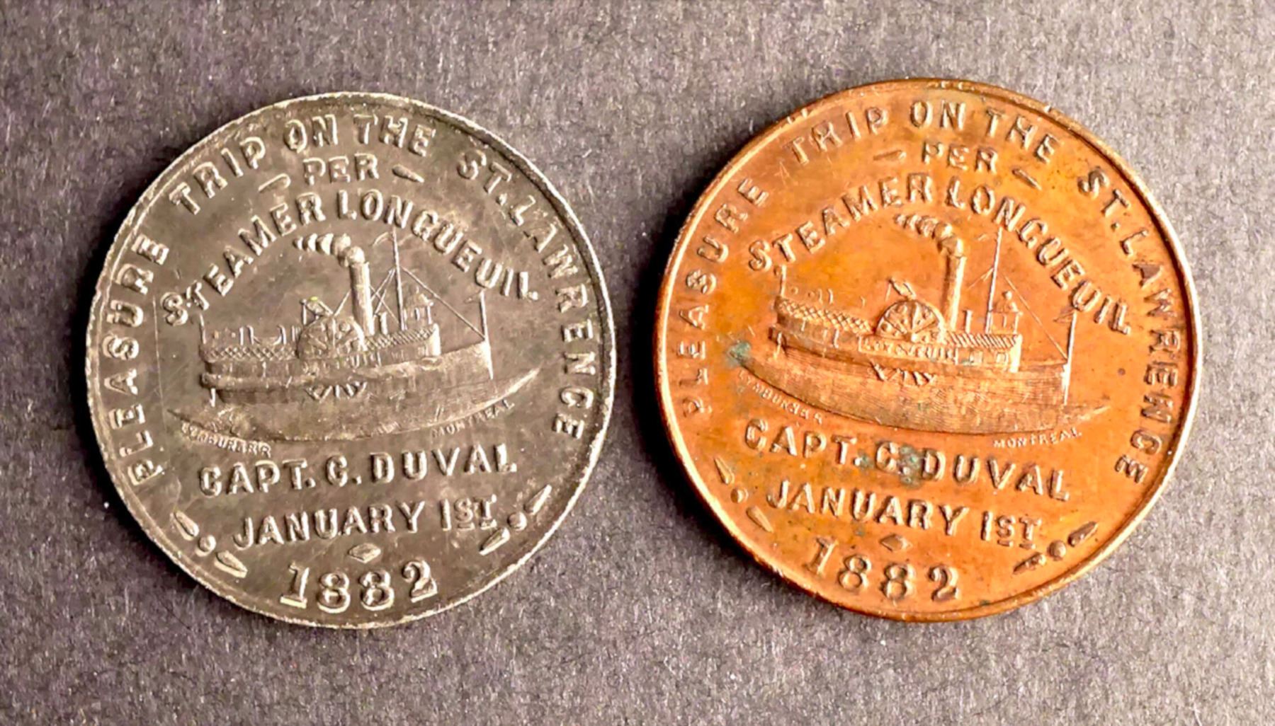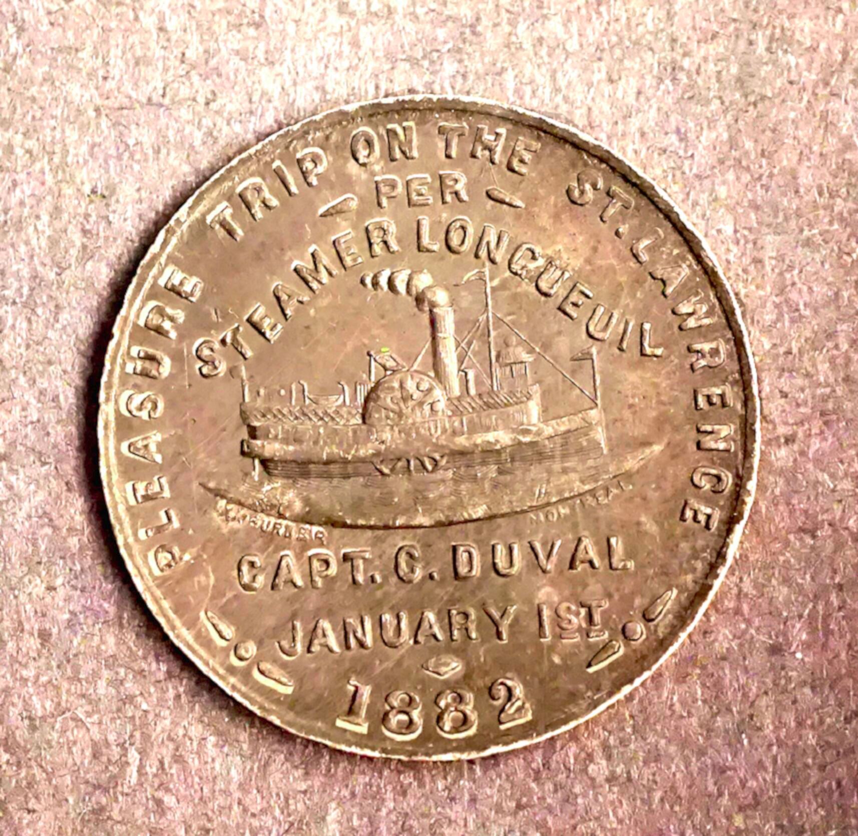 1) Design of steamship at obverse center PLEASURE TRIP OF THE ST. LAWRENCE / --per-- / STEAMER LONGUEUIL / CAPT. C. DUVAL / JANUARY 1st, / 1882. Signed: LYMBURGER below ship, to left. Reverse: French text as obverse, except instead of captain is OVIDE DUFRESNE / GÉRANT below date. Condition is R&B UNC. Copper, 37 mm, 26.3 grams. 2) As the other, but white metal, 11.6 grams. Apparently the same dies.